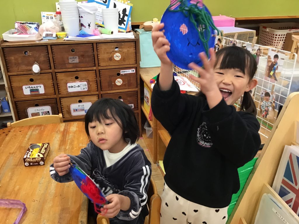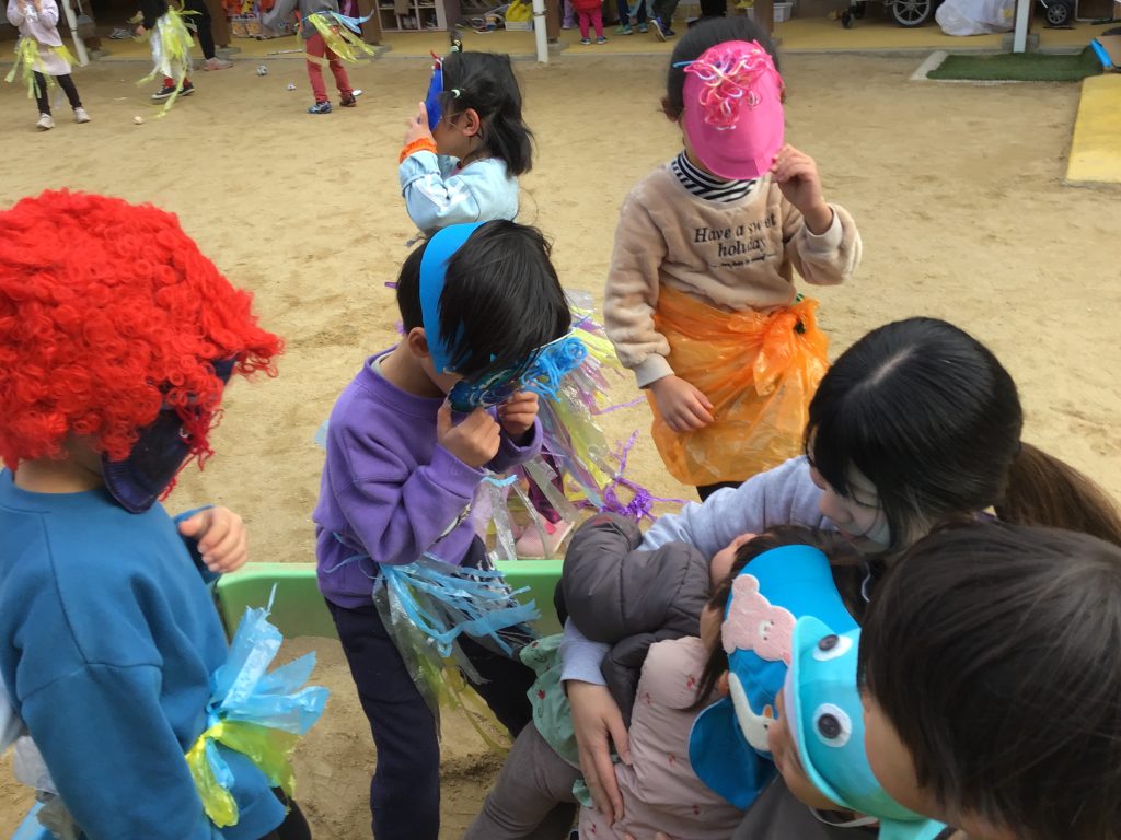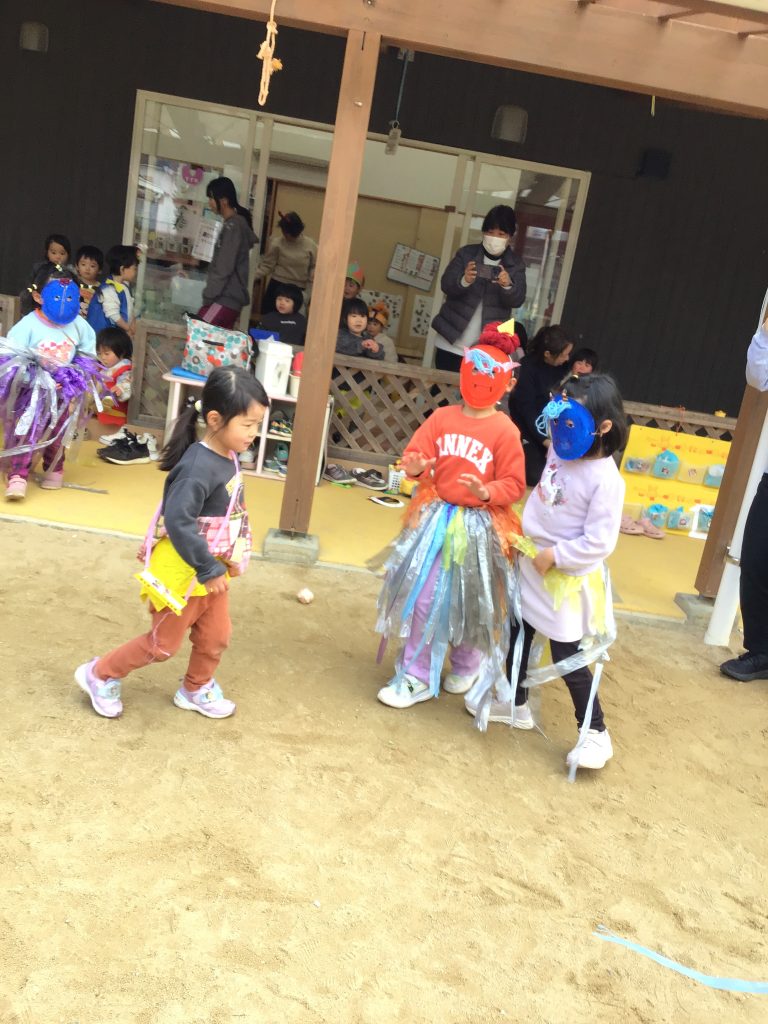 節分の日には「小さい子を驚かせる!」と、鬼の面や衣装作りをしてきました。節分の由来を聞くことで、興味や関心をもちながら親しみをもって鬼役になっていました。