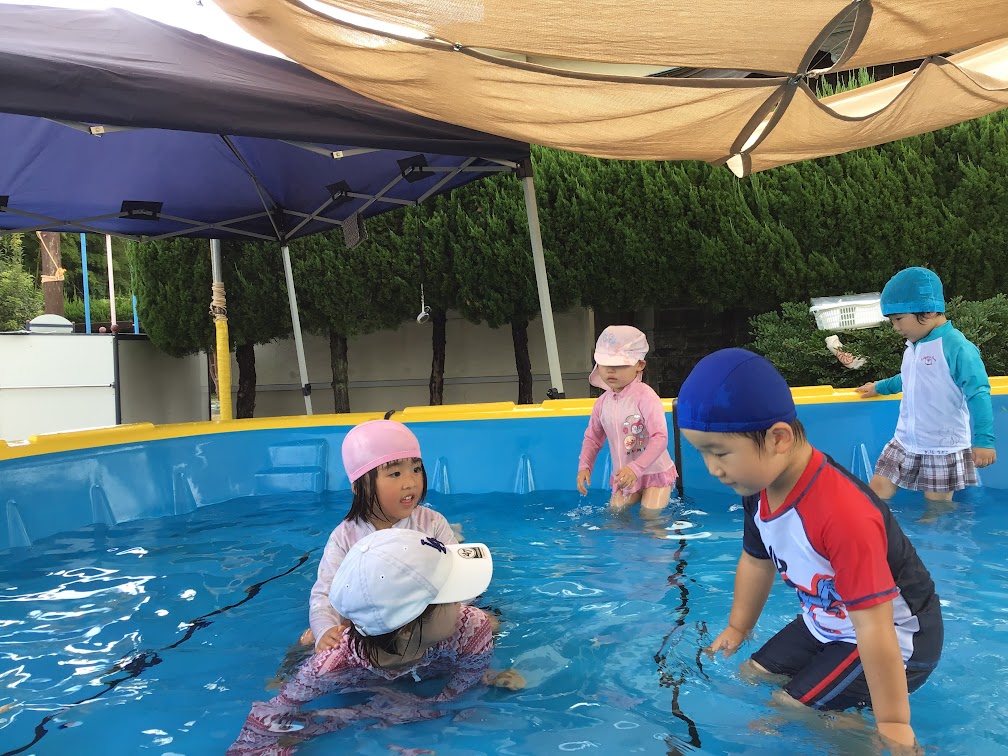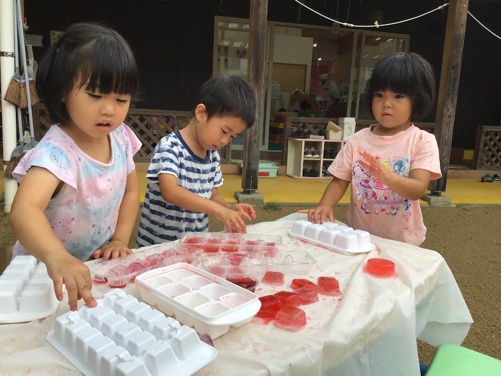 プールや寒天、氷など様々な感触遊びを楽しみました。プール遊びでは、苦手な園児は保育教諭等が一緒にプールに座ってみたり、保育教諭等の体に乗ってみたりして水に慣れることを楽しみました。友達や保育教諭等と楽しかったことなどを共有し、受け止めてもらうことで安心して自己表現ができるような環境を整えていきます。