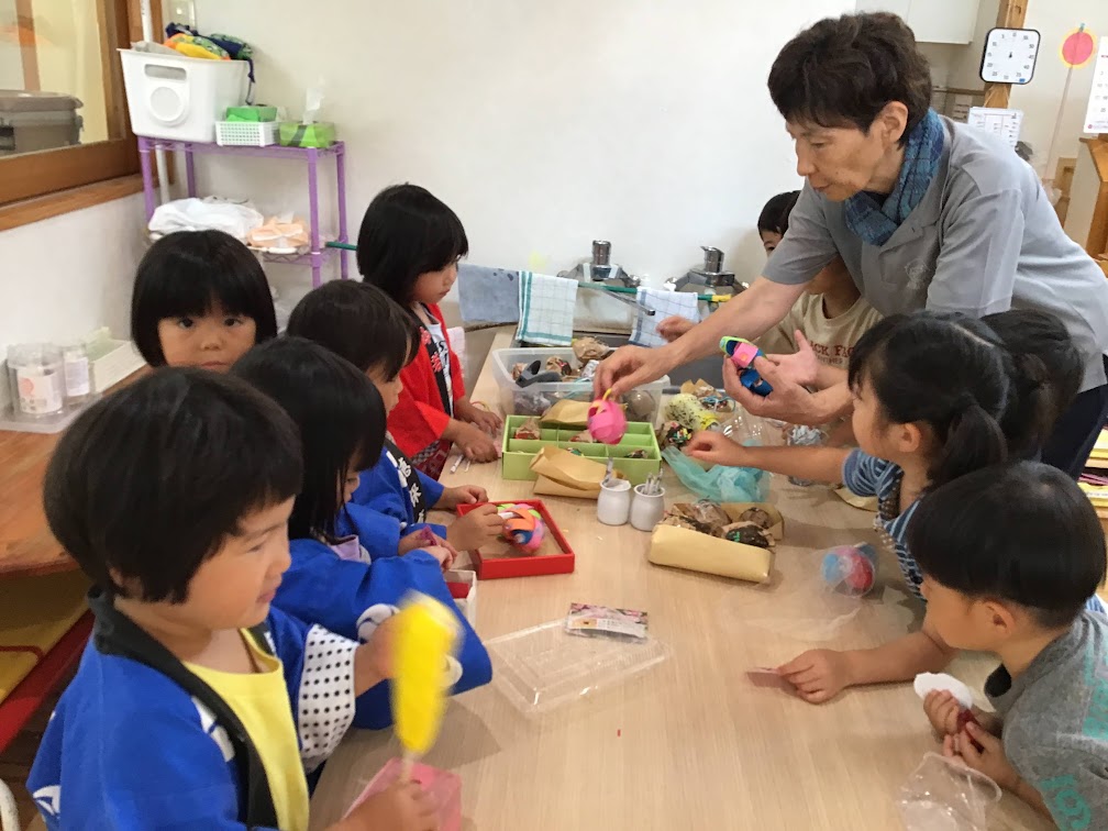 お祭りごっこでは、法被を着て「いらっしゃいませ」と気合十分のひばりさん。「こちらもありますよ」と商品を季節の行事やごっこ遊びを通して自分のイメージや言葉などで表現する力を培っていきます。