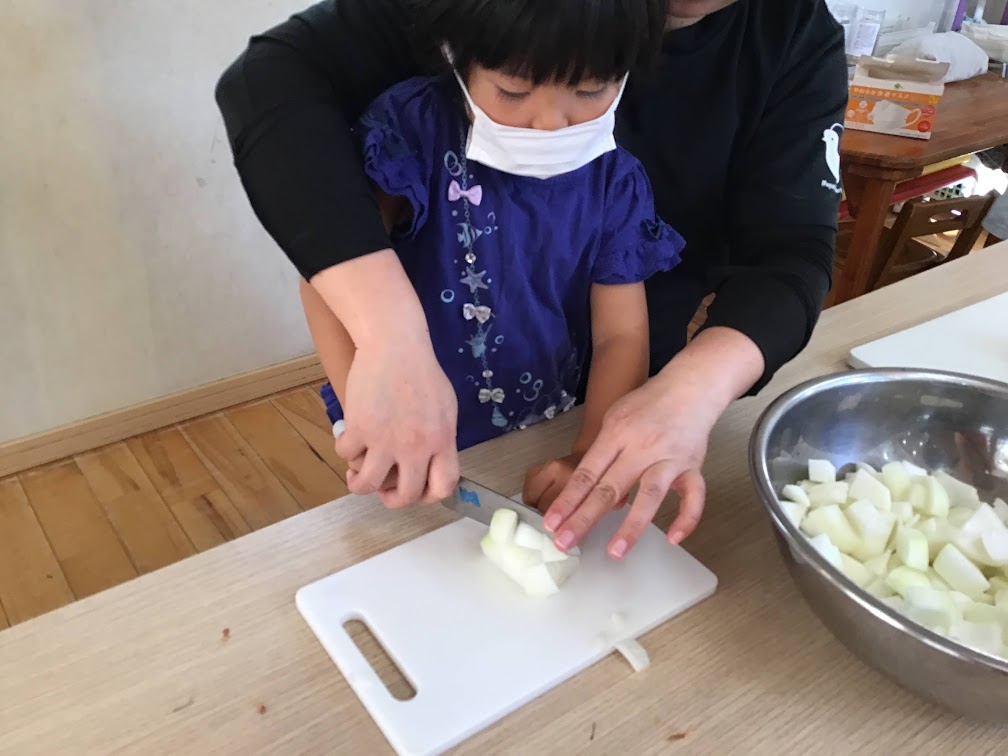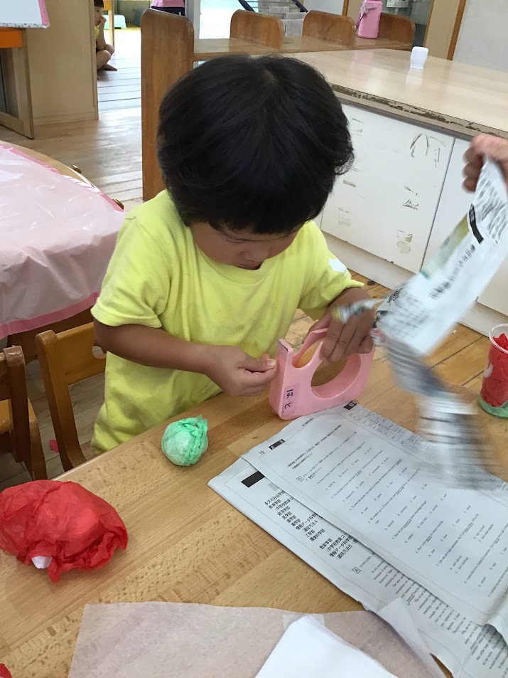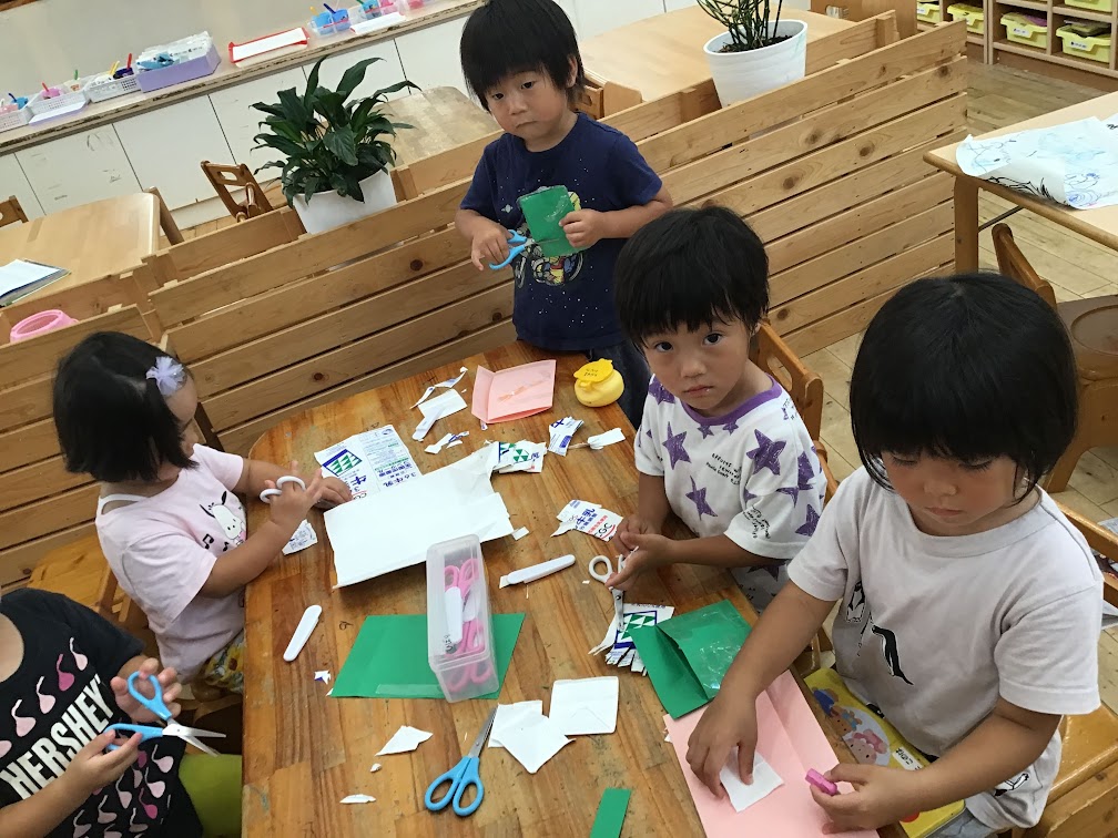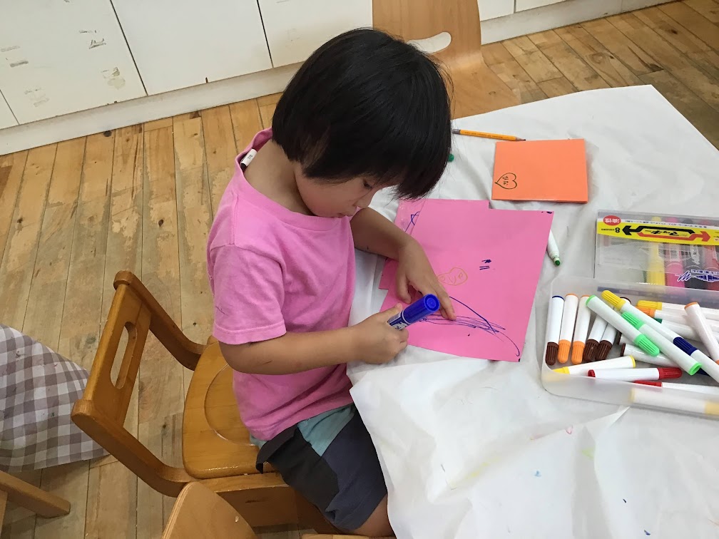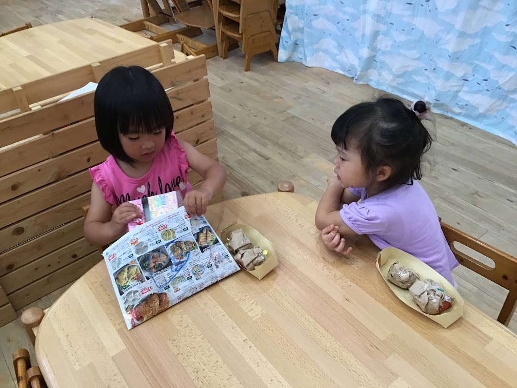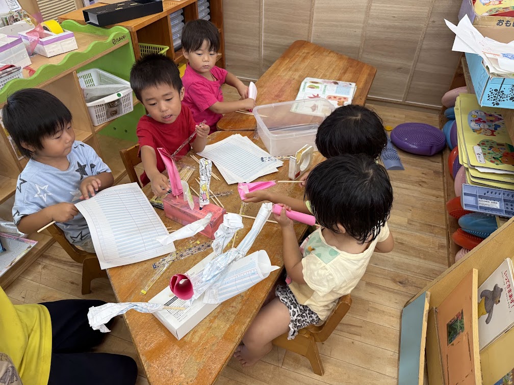 お祭りごっこでは、チョコバナナやチケット作りをしました。はさみやのりを使うことが楽しい様子のひばりさん。画用紙や折り紙など様々な素材を使って製作を楽しんでいます。様々な素材に触れることで、表現する意欲や想像力を育むことへと繋がっていきます。