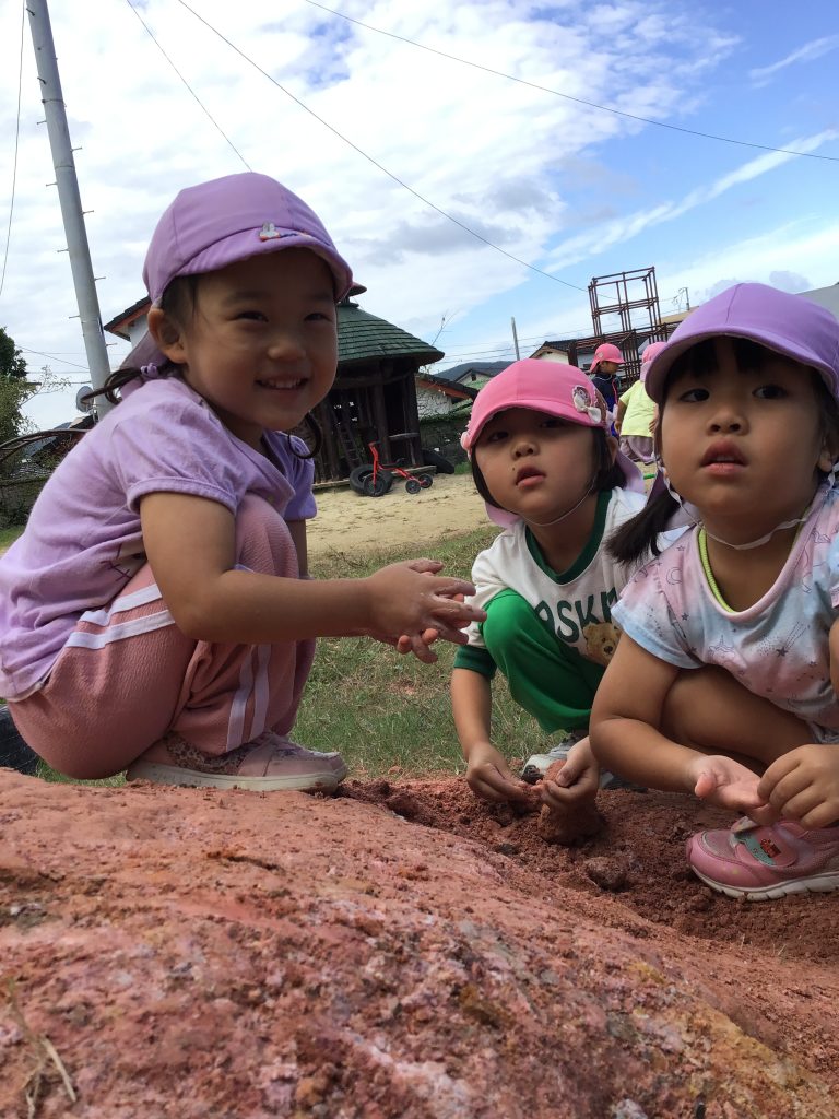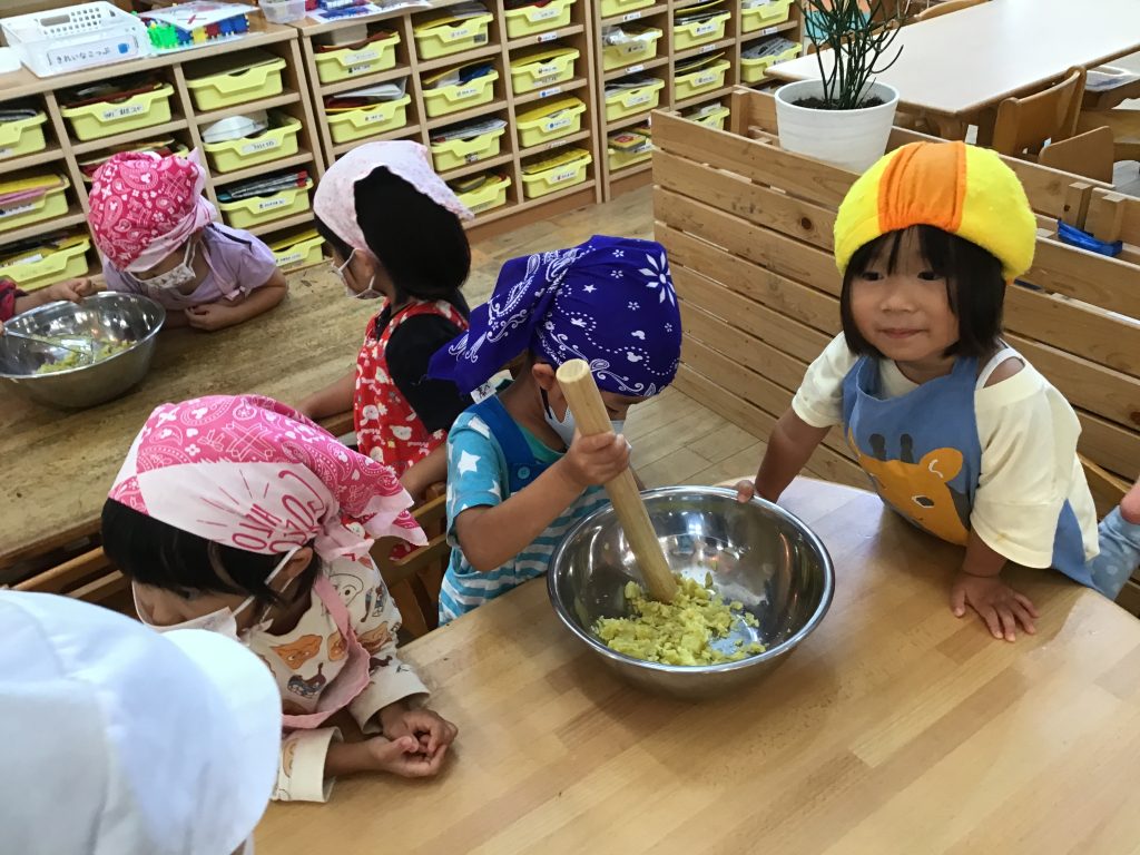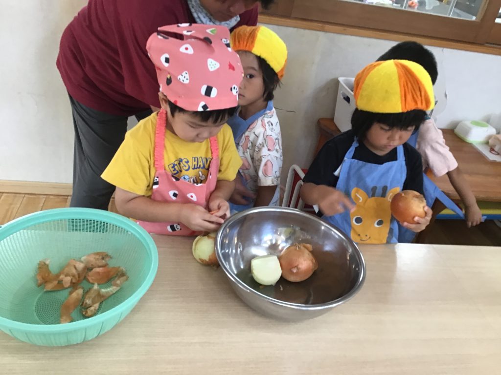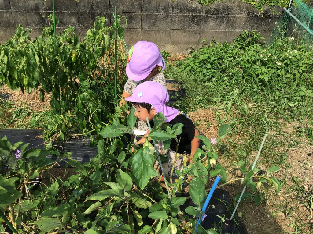 夏野菜を収穫したりお芋掘りをしたり、玉ねぎの皮むき、スイートポテトづくりのクッキングなど経験しました。忍者の広場の畑へ行くと、「このピーマンもう食べられるかな?」、「収穫した野菜はキッチンに持って行こう」など園児の方から嬉しそうに知らせる姿も見られます。食物に興味や関心をもち、食べてみたい気持ちが高まり、進んで食べてみようとする姿が育まれます。