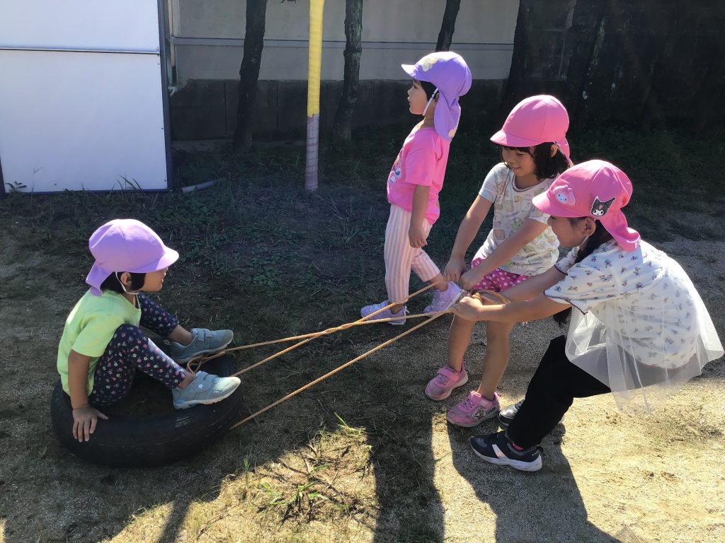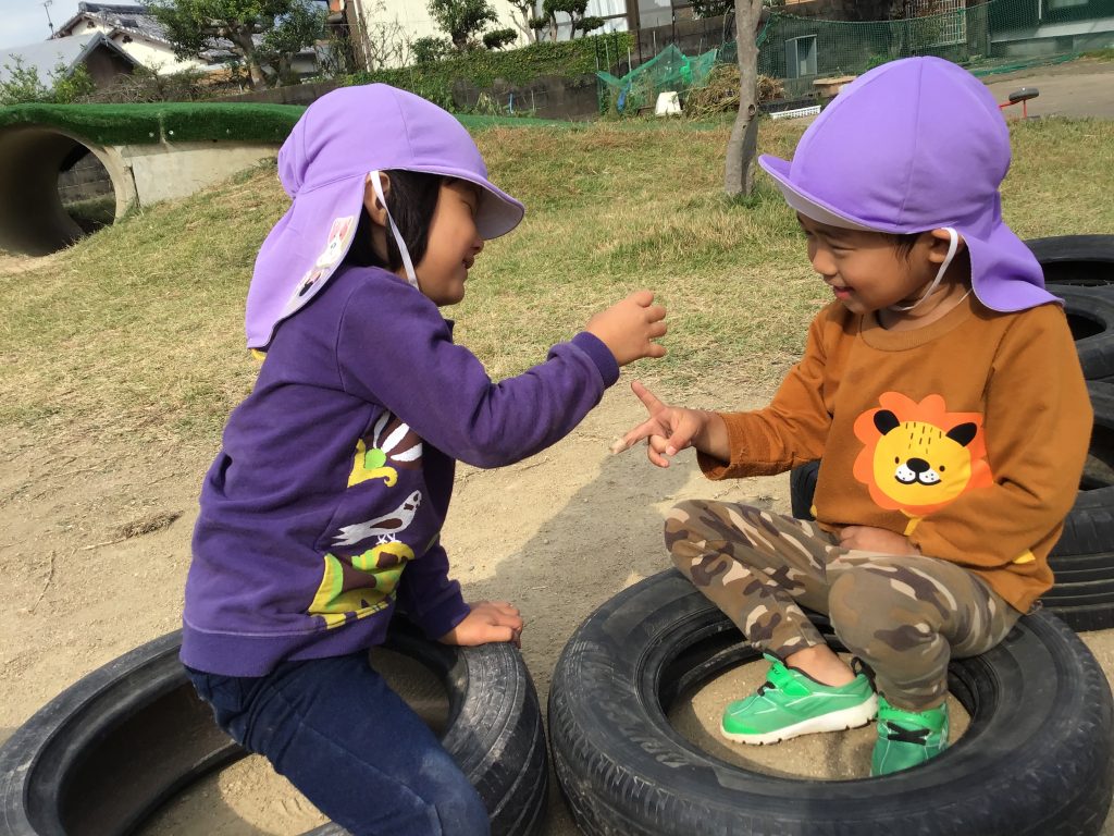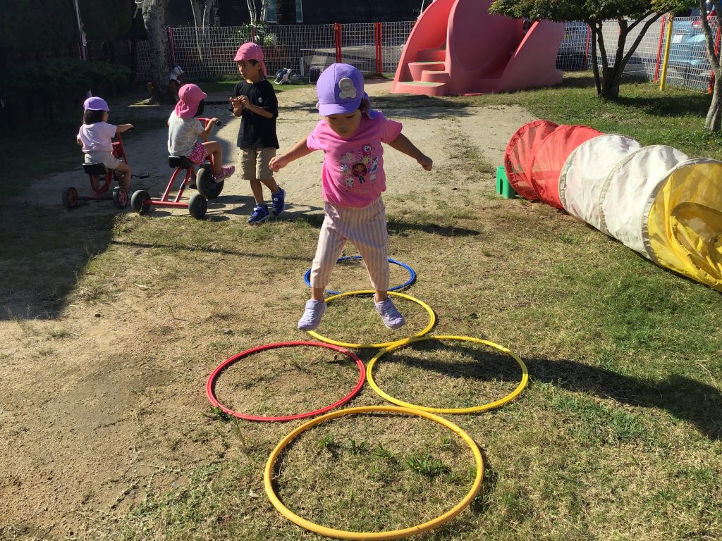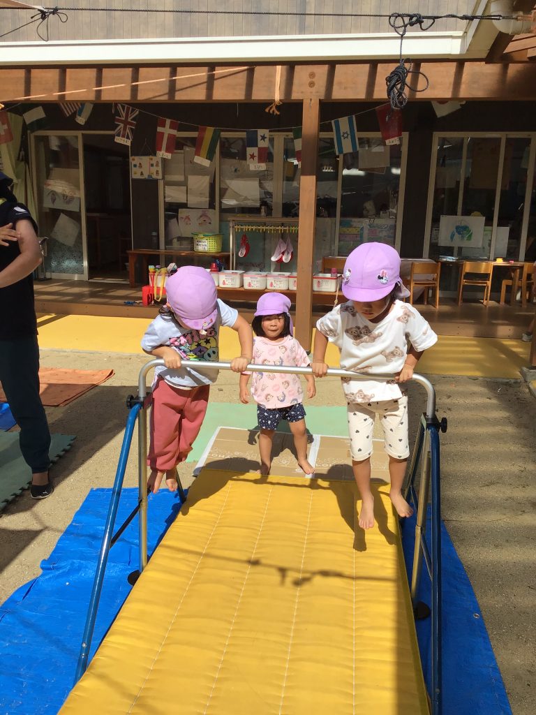 戸外でトンネルをくぐったり、巧技台に上ったり、ケンケンパをしたり様々なことに挑戦する姿が見られました。巧技台では、一本下駄を履いて平均台を渡ろうとする姿まで見られ、何事にも挑戦する姿が輝いて見えます!!