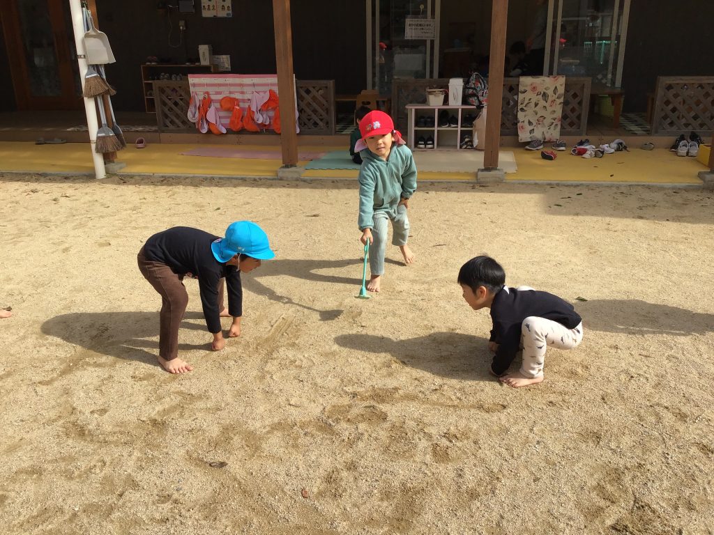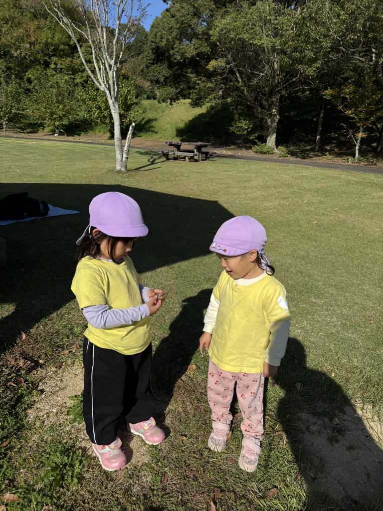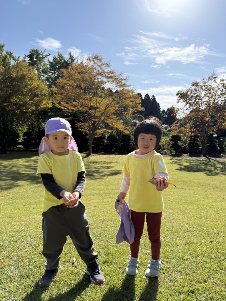 秋の探索で樹木園へ。どんぐりを見つけては「あったよ」と知らせてくれたり、落ち葉を踏んだ音を聞いて「カシャカシャするね」と様々な発見が!!自然に触れて遊ぶ中で、開放感を味わい園児たちの笑顔もたくさん見られました。