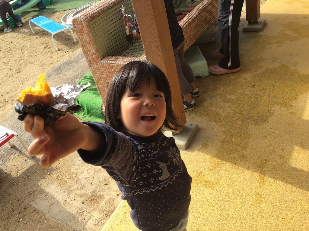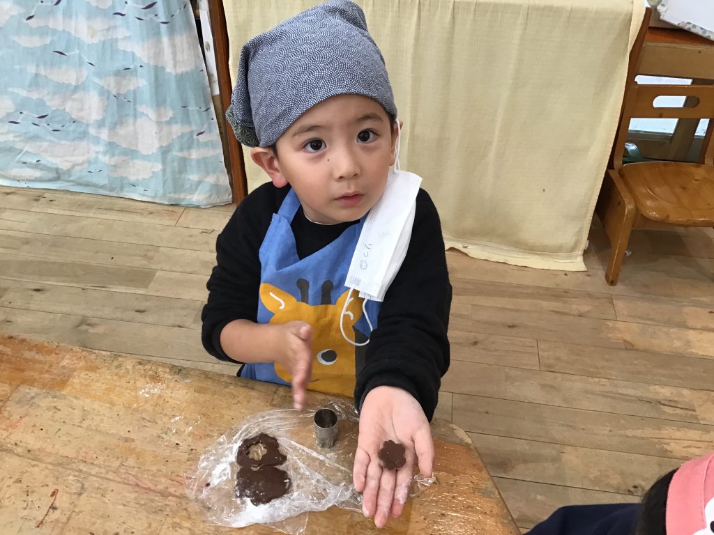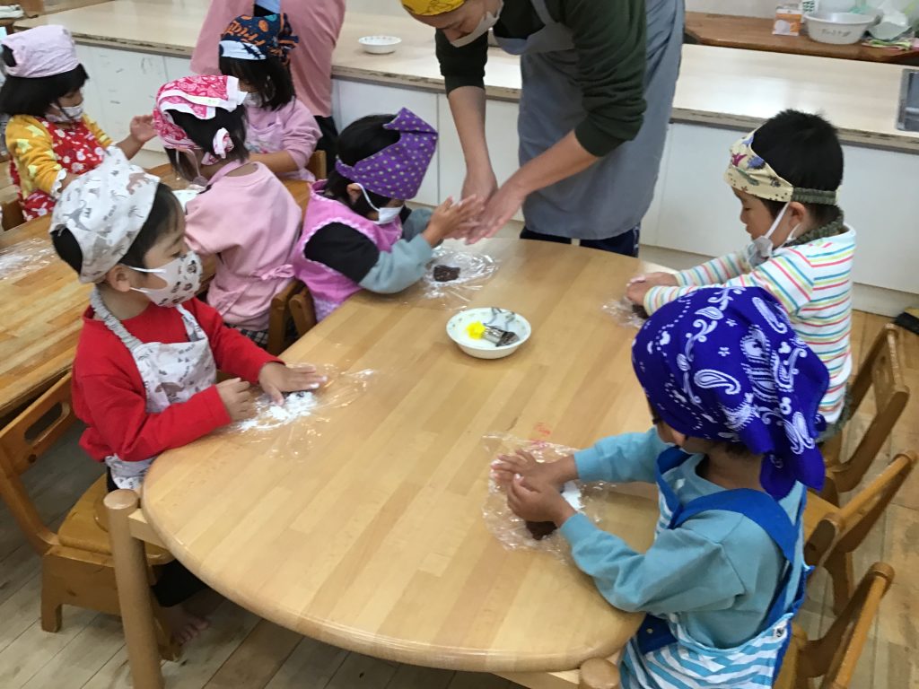 火おこしをし、焼き芋をしました。皆で協力しながら作った焼き芋は格別だったようで「おかわり」の声が止まりませんでした。プチクッキングでは生地から作り、型抜きをしました。日頃から「食」への興味関心が広がるよう保育教諭等や仲間などと食事を楽しみ合う経験を大切にしています。