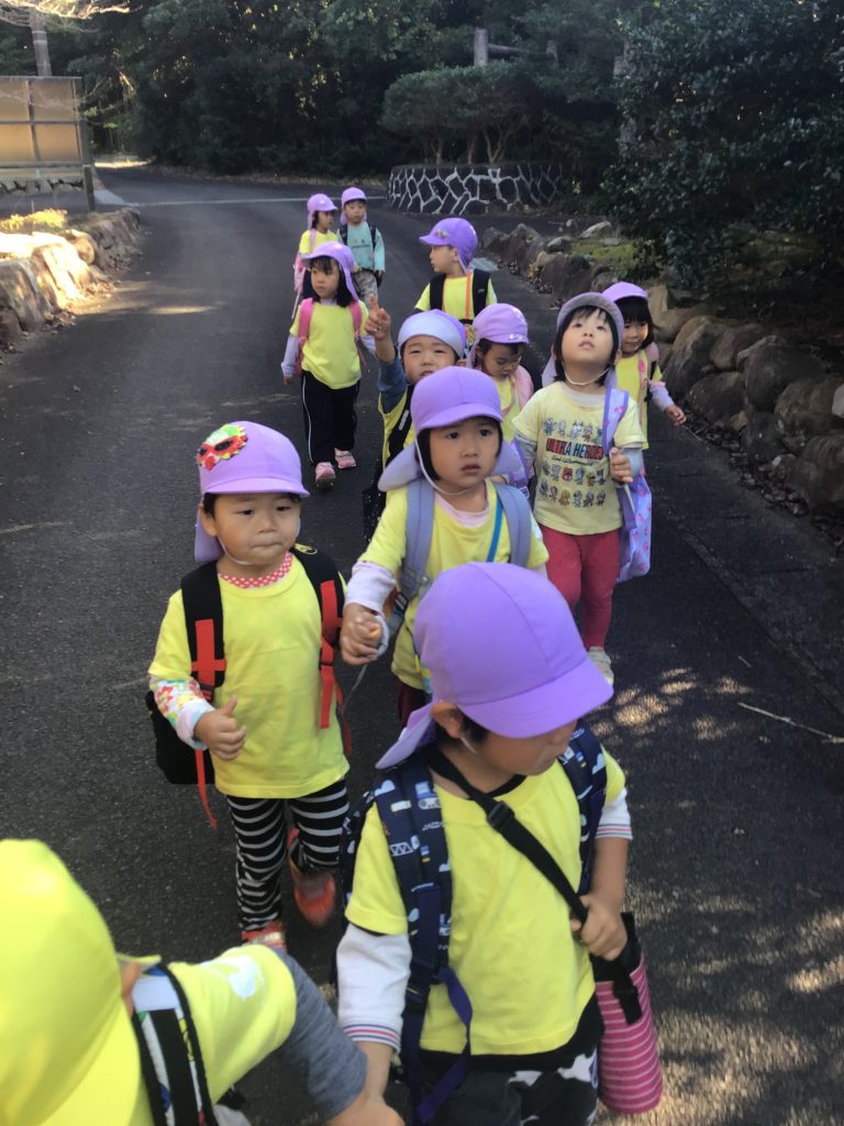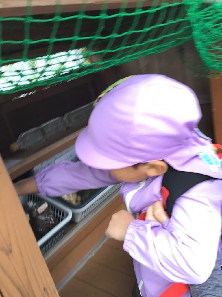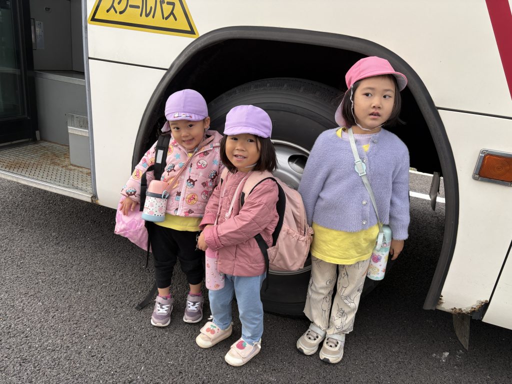 月に1回のお弁当日にバス工場へ出掛けました。実際にバスのタイヤの横に立ってみると、タイヤの大きさが園児の身長と一緒で、驚く表情も見られました。途中無人売り場で里芋を見つけたり、落ち葉の上を歩きながら音を楽しんだり、様々なものに触れ合う体験ができました。