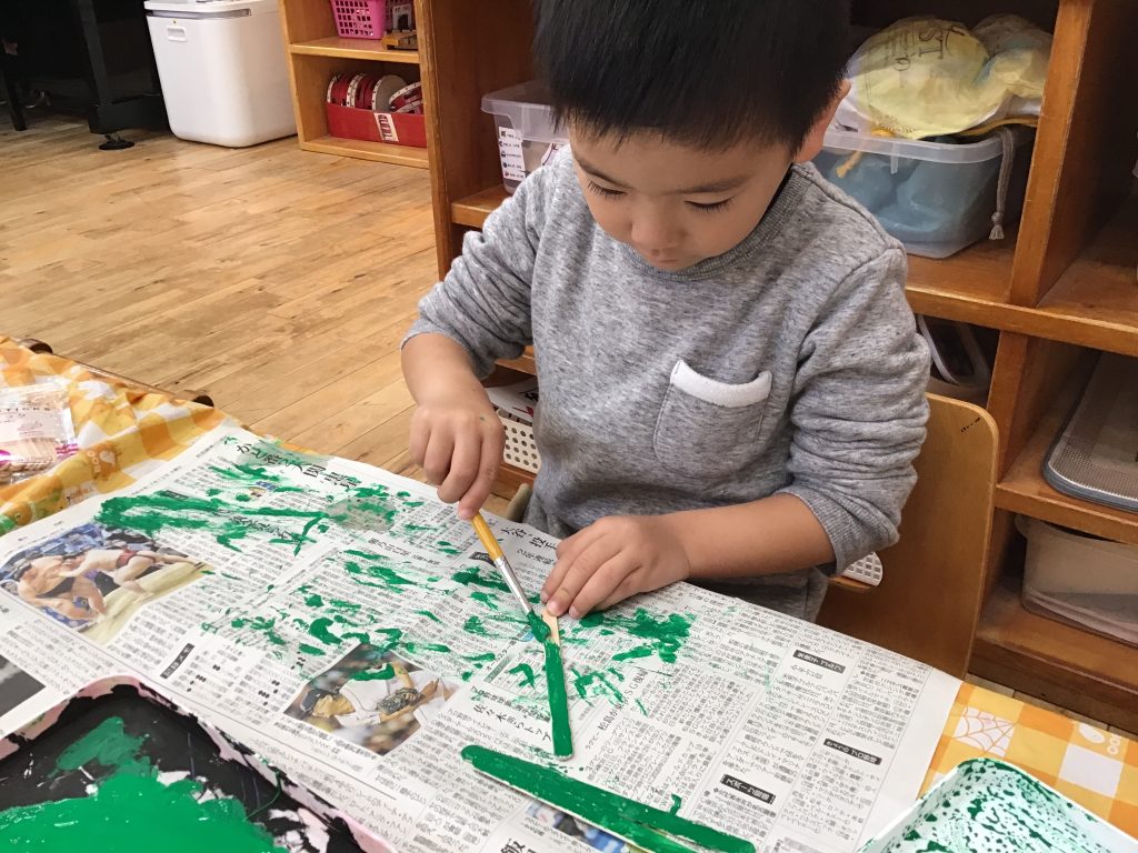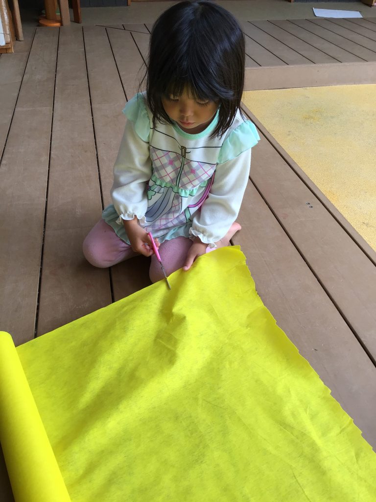 絵本の「ねずみのすもう」を保育教諭等が園児の前で劇遊びをしました。その後園児の方から「やりたい」という声があり、まわしを作ったり、相撲をとってみたりする可愛らしい姿が見られました。友達と共通の目的をもって遊びを楽しむことで、協力して描いたり、作ったりする姿も見られるようになります。