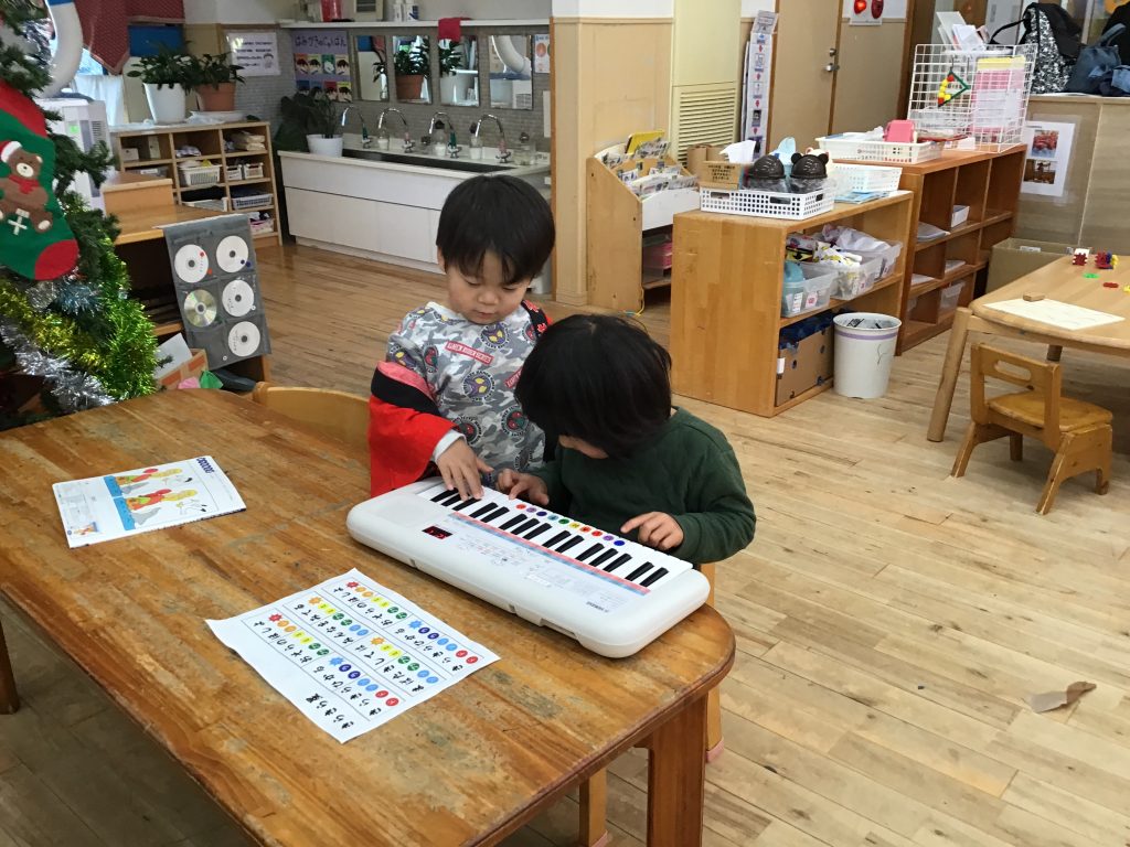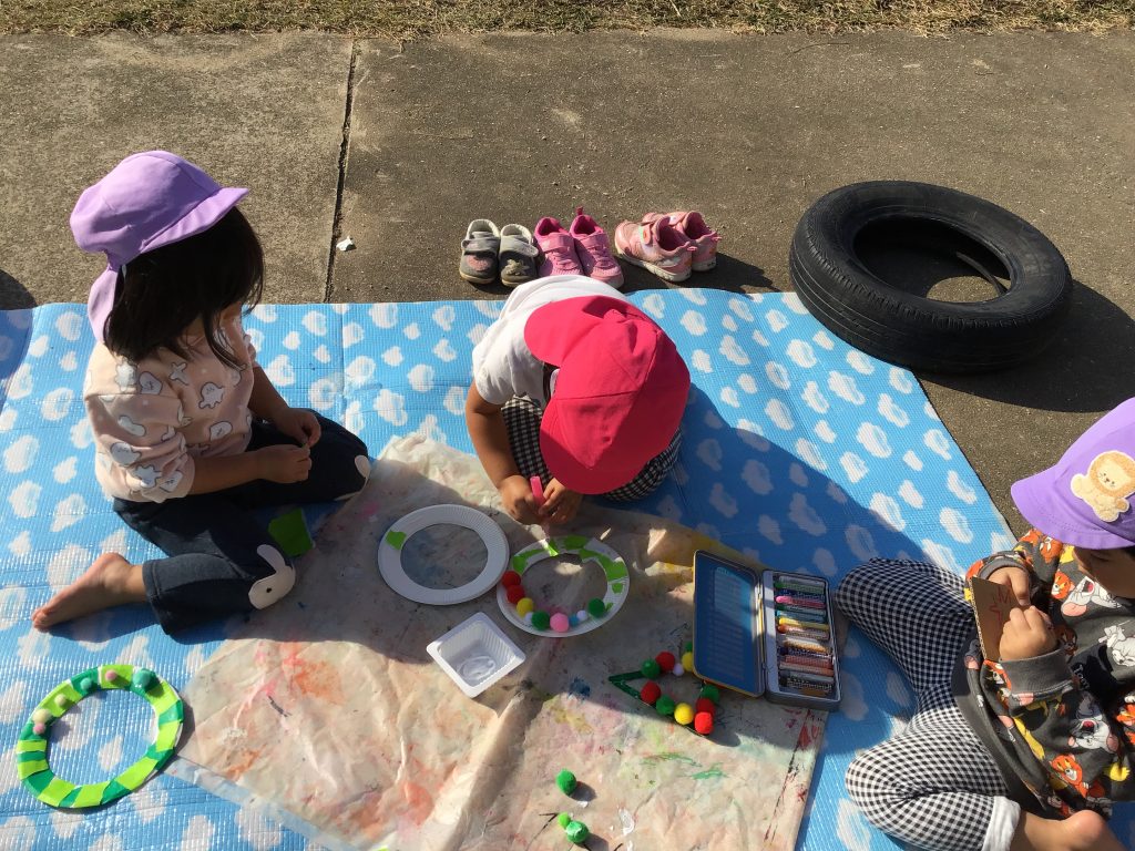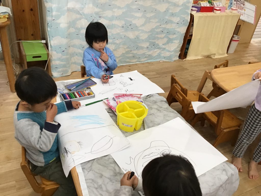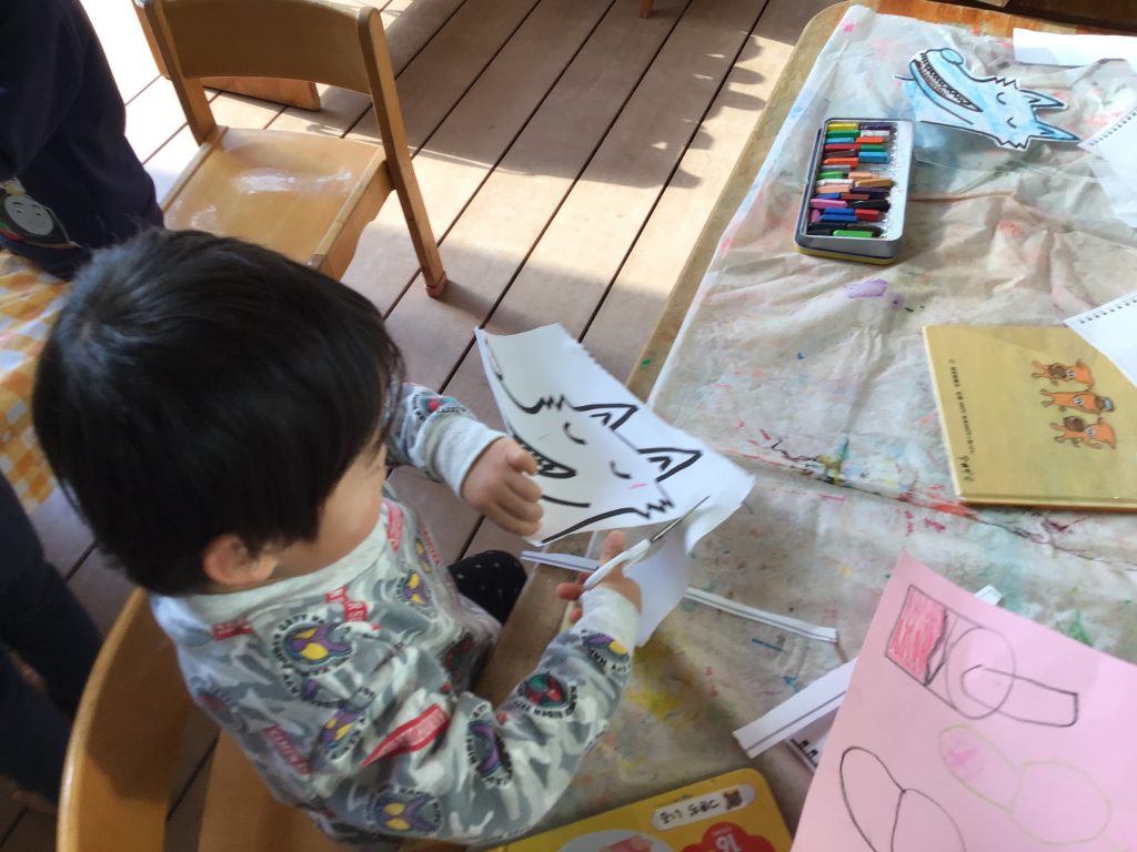 「もりのおふろ」のお面作りやおたのしみ会の楽しかったお絵描き、クリスマスの製作などをしました。クレヨンでお絵描きしたり、ハサミで切ったり、折り紙をちぎってのりで貼ったりといろんな工程を楽しんでいます。