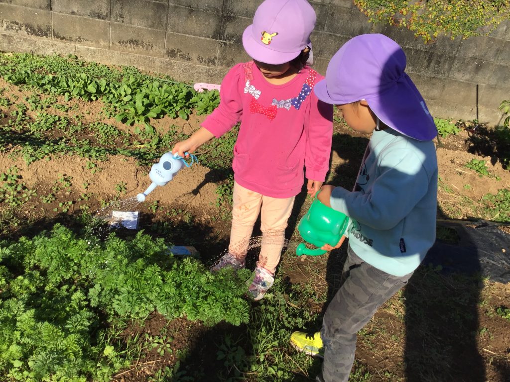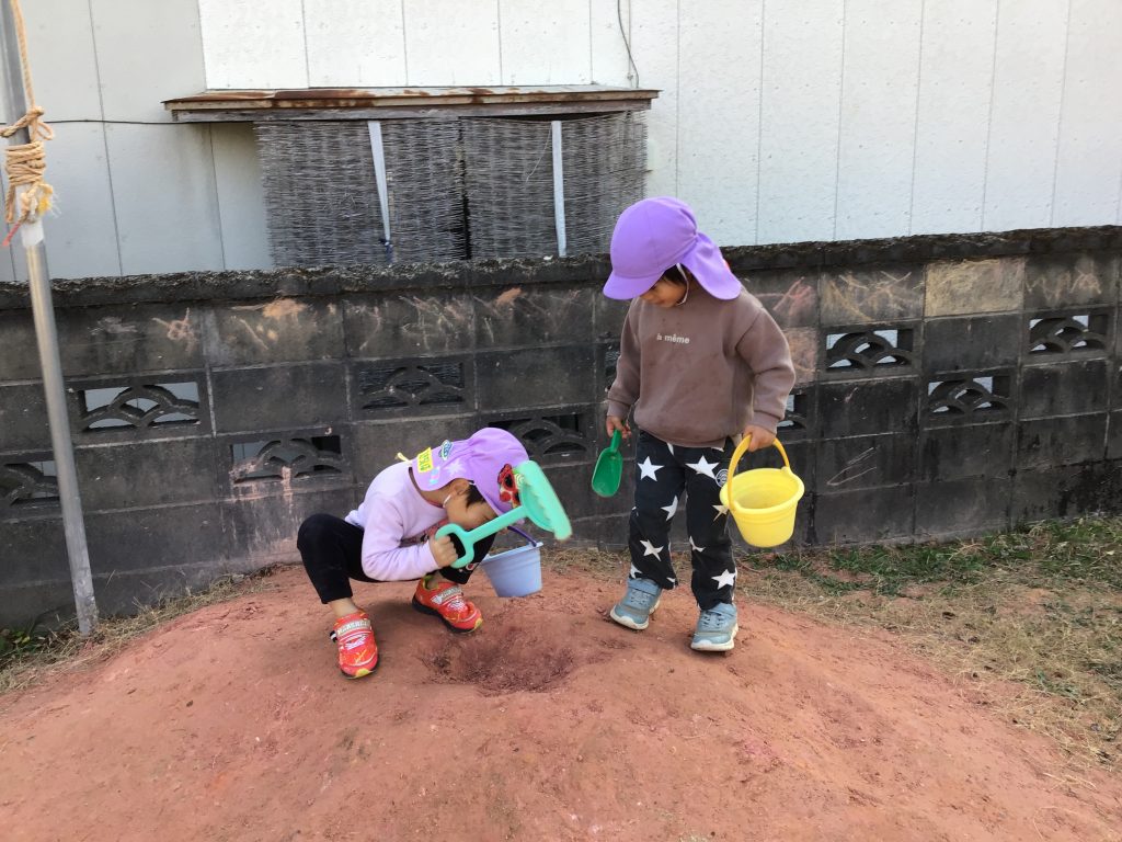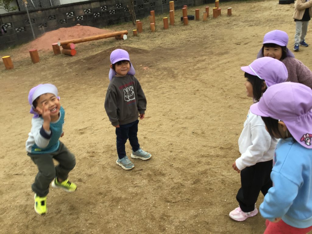 戸外で太鼓橋をしたり、はないちもんめをしました。はないちもんめでは、最初2~3名で遊んでいると次第に他の園児も気付き、遊びに入ってくる姿が見られました。友達と共に過ごす楽しさや喜びを味わっています。