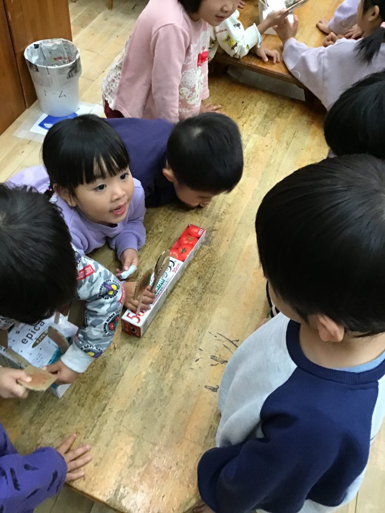 アイス屋さんやジュース屋さんなどお客さんとお店の人に分かれてごっこ遊びが盛り上がっていました。また、遊びの中では「これ貸して」「いいよ」というやり取りも増え自分の思いを言葉で伝えようとしたり、相手の気持ちを受け止めようとしたりといった成長した姿が見られます。