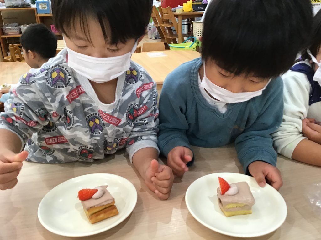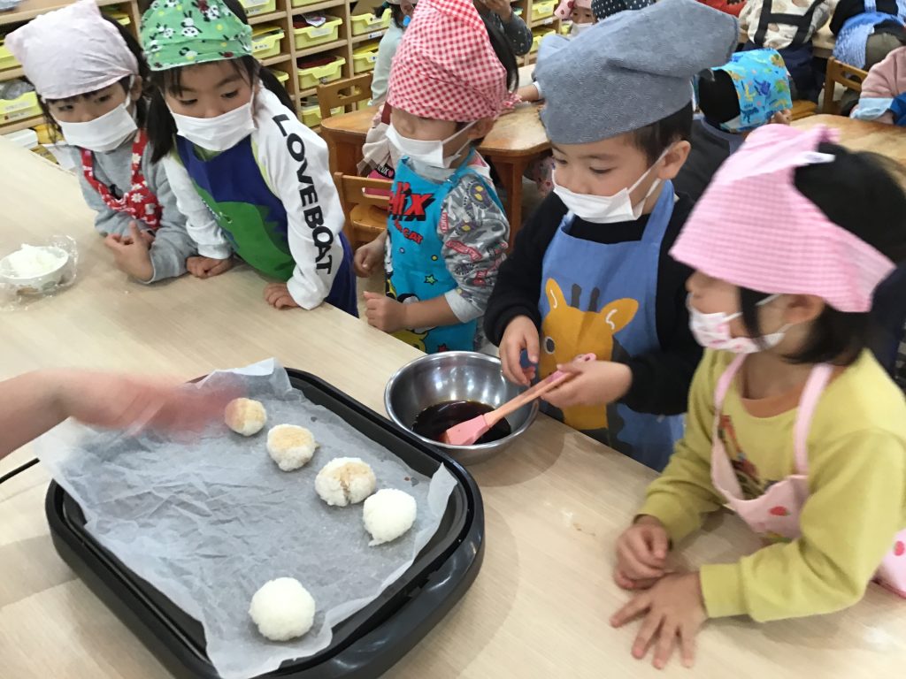 焼きおにぎりやクリスマスデコレーションケーキを作りました。エプロンをつける時から嬉しそうな姿が見られました。食材を目にしたり、触れたりする機会などを通して、園児は自らの感覚で食材や食の環境に興味をもつようになります。