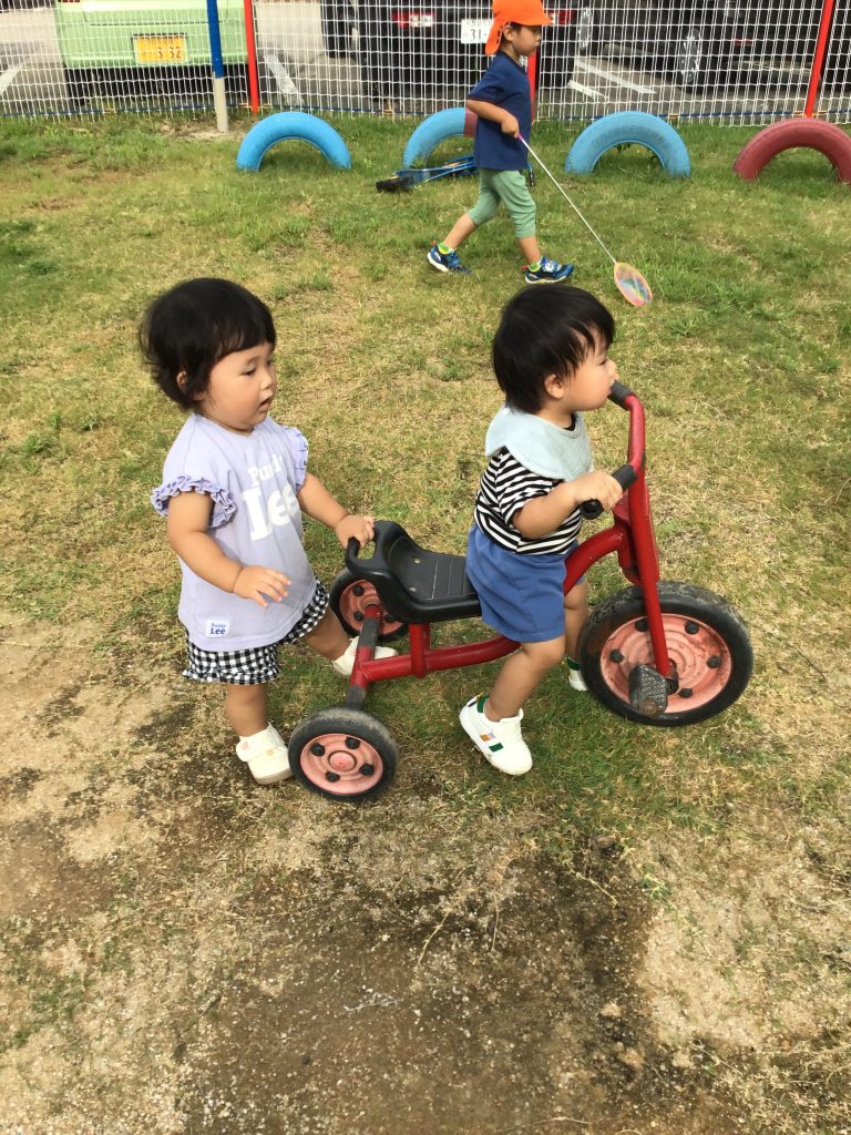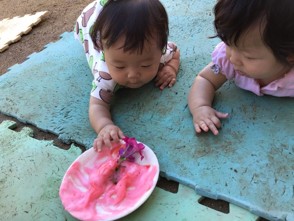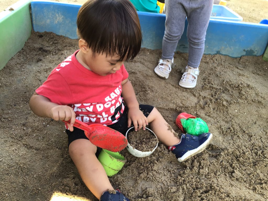 暑さが少しずつ和らぎ戸外で遊べる時間が増えてきました。外気浴や散歩、砂遊びなど一人一人の発達や興味によって遊びは違いますが、戸外での遊びの中で夏から秋への季節の変化を肌で感じるとともに、おひさまの光を浴びることが健康的な体づくりにも繋がっています。