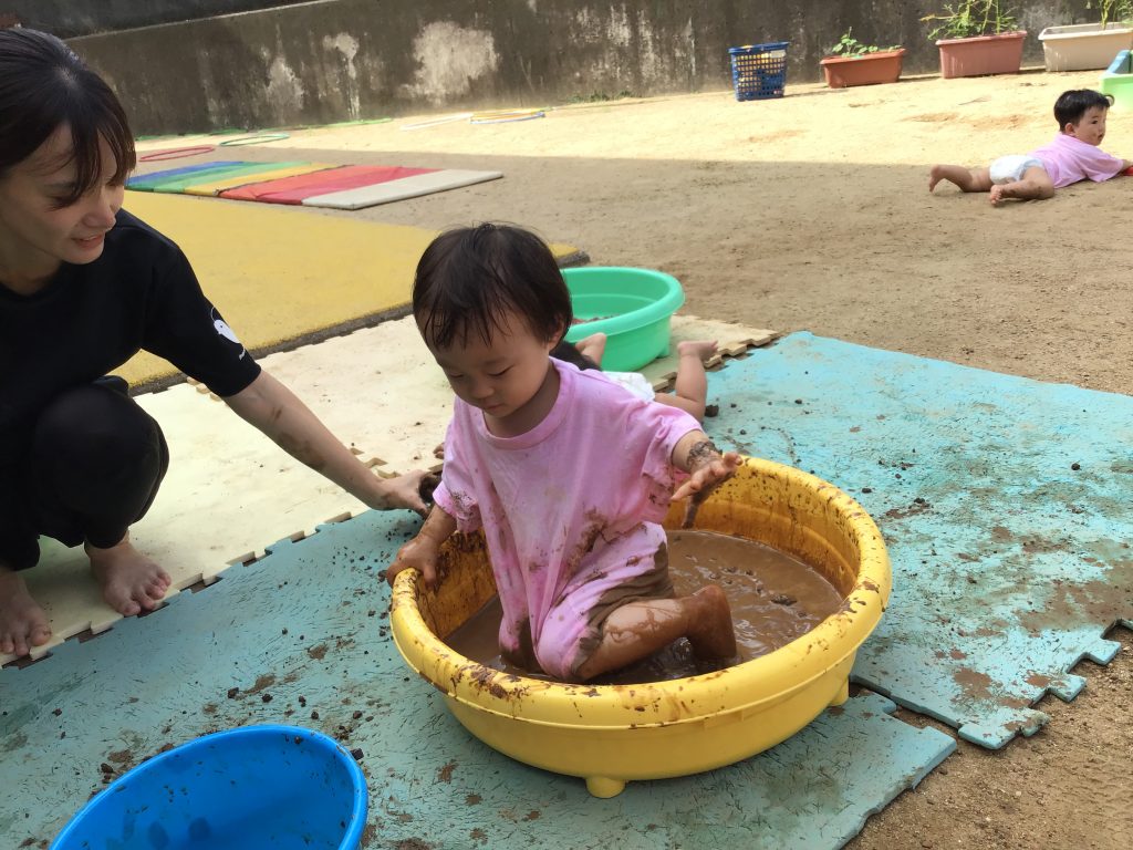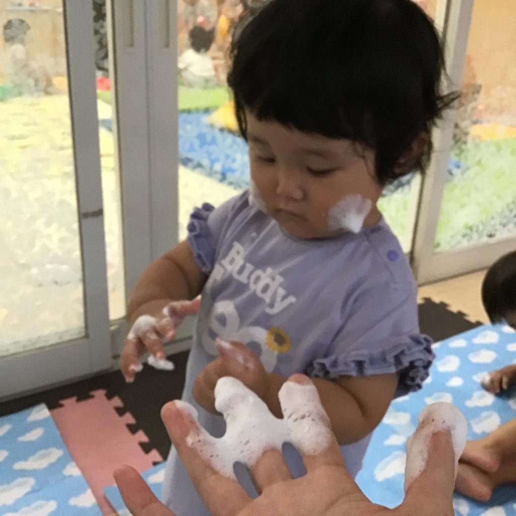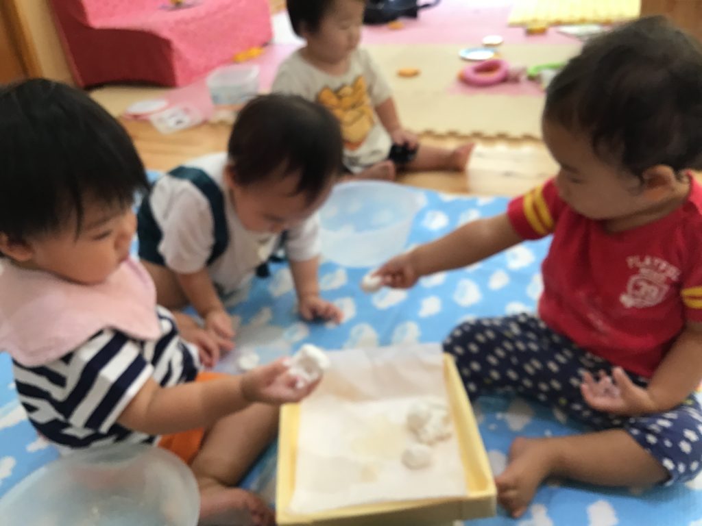 泥や泡遊び、お月見団子づくりなど様々な感触遊びを楽しみ、保育教諭等や友達と一緒に手触りや色、形などの発見に驚いたり喜んだりしました。園児一人一人が何かを感じて知らせようとする姿を丁寧に受け止めながら共感的に応えることで豊かな感性を育むことへと繋がっていきます。