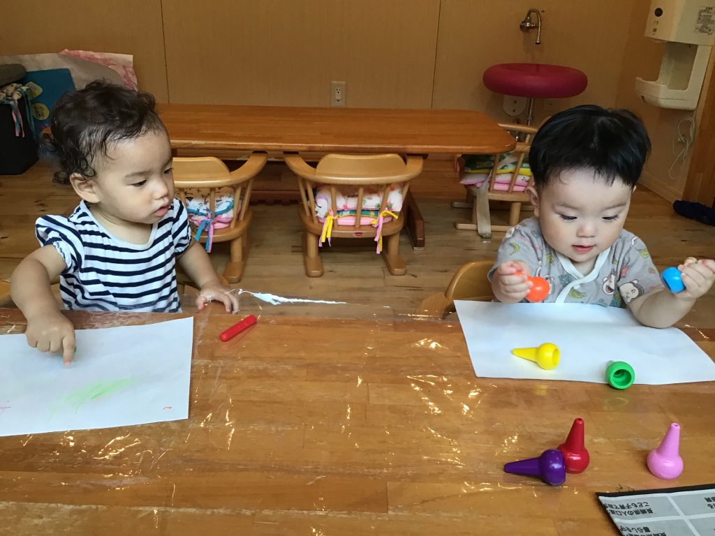 新聞プールやお絵描き、ままごとなど様々な遊びを友達と同じ空間で楽しみました。一人一人が遊びを楽しむ中で隣で遊ぶ友達の姿に気付き、気になってじっと見つめてみたり、同じものを欲しくなったりと遊びを通して友達への興味関心が広がっていきます。