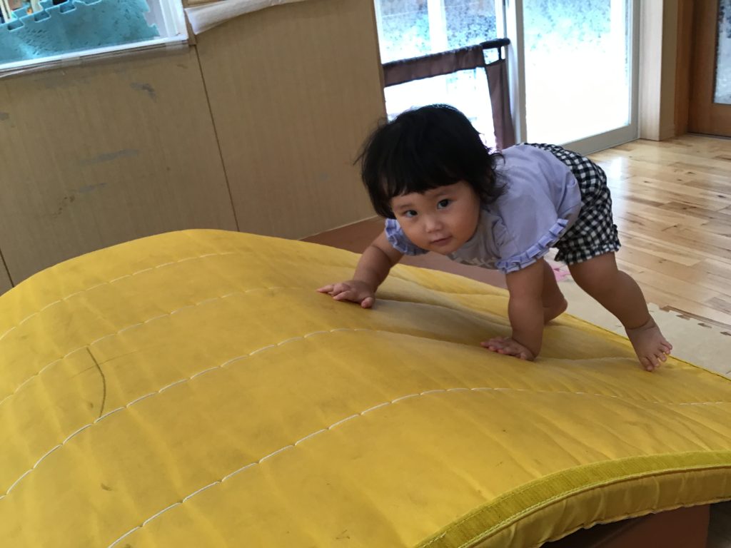 段ボールなど身近な物や運動用具、園庭の遊具等に関わりながら体を動かして遊びました。トンネルをくぐるために四つばいになったり、はしごや山、段差を上るために踏ん張ったり何かを掴んだりと、一人一人が発達に合わせた環境の中で体を動かす楽しさを経験しています。