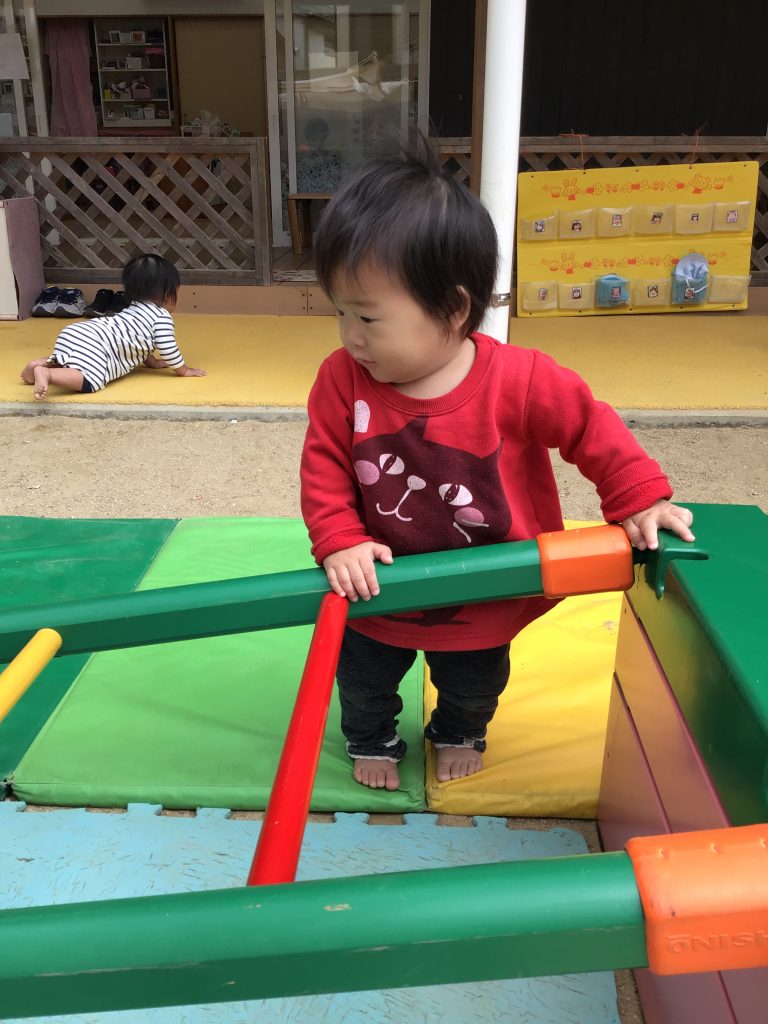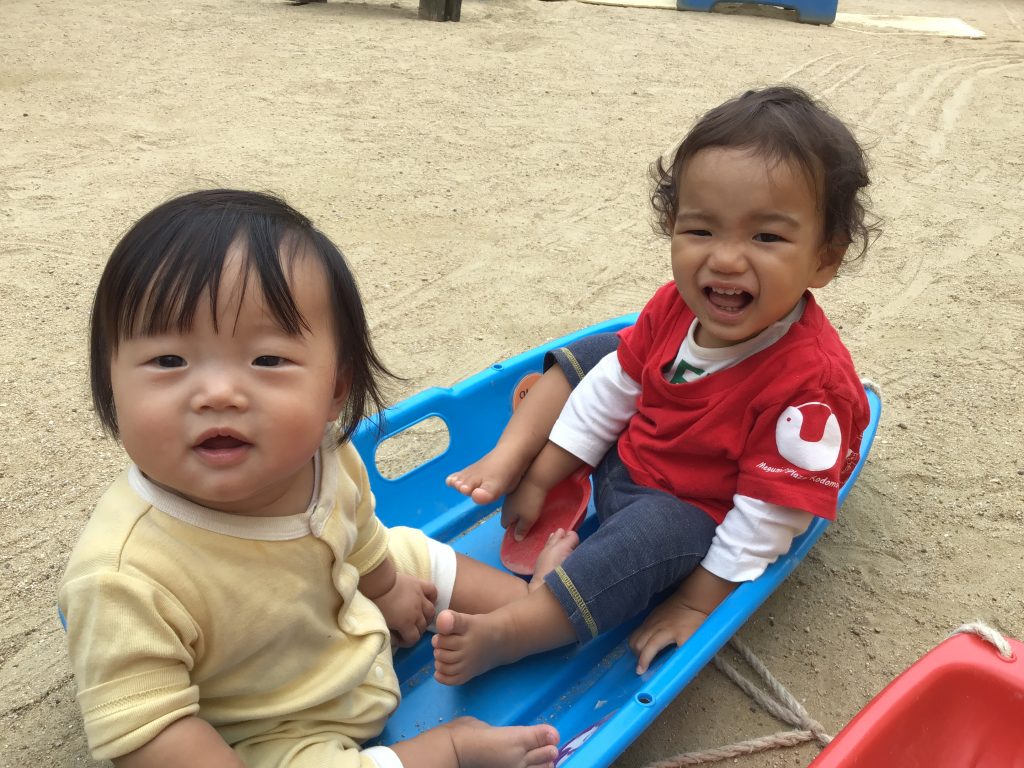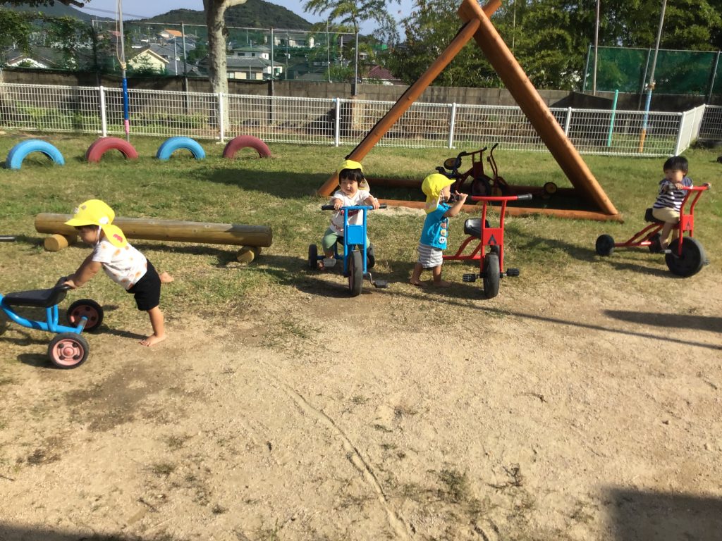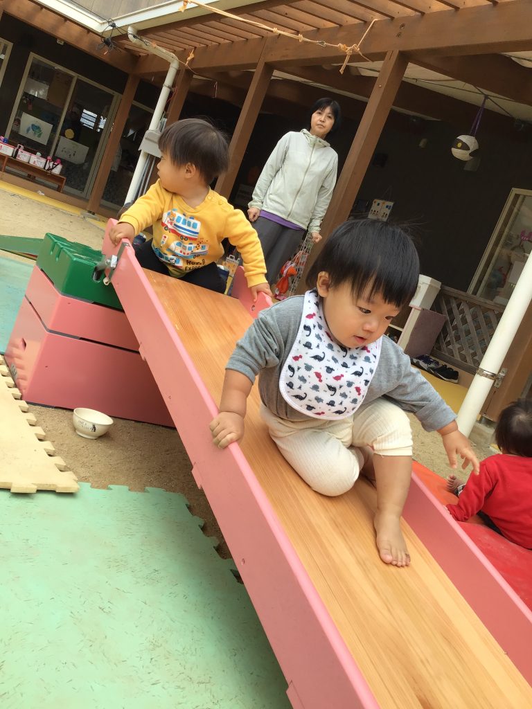 お兄さんお姉さんに憧れて三輪車に乗ってみたり、巧技台に挑戦しています。ソリ遊びでも体のバランスを保ちつつ笑顔が素敵ですね。