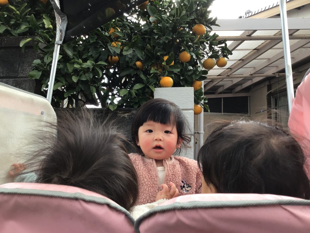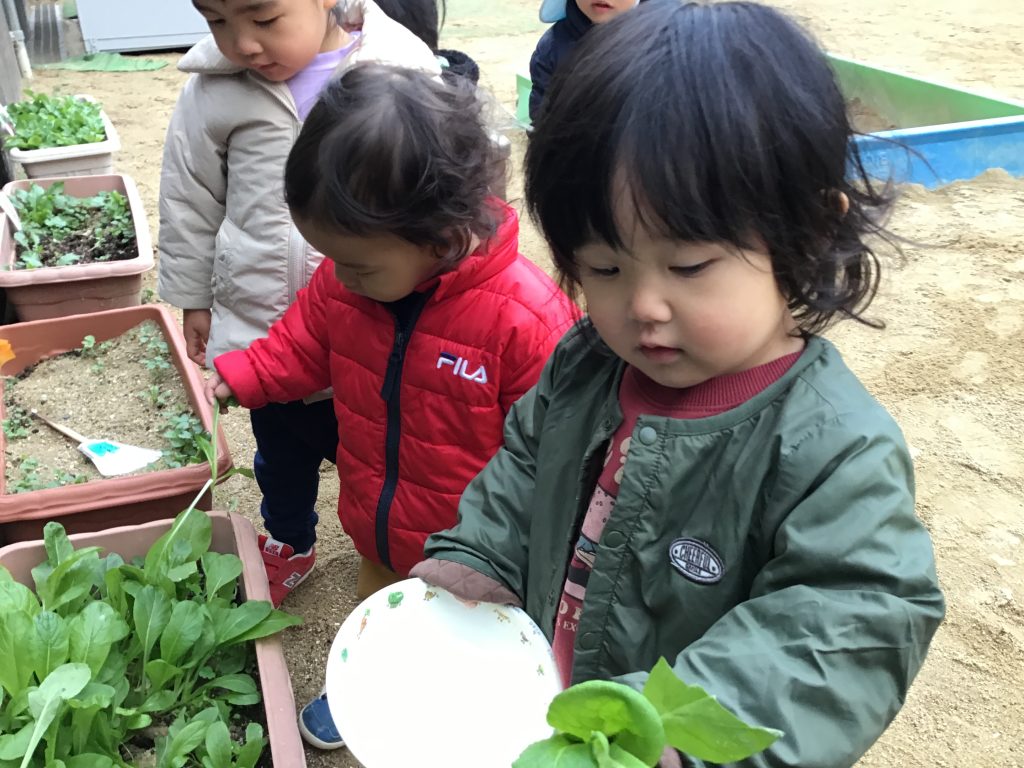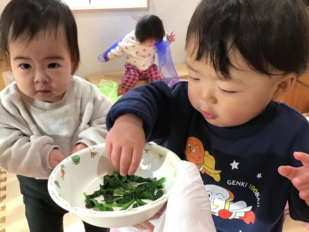 生長した小松菜を収穫し、その日に調理して食べたり、みかんの木のある場所までお散歩に出掛けたりしながら冬ならではの食べ物に触れたり見たりする体験をしました。身近な環境の中で様々な食材に触れる中で、「これ何だろう」「食べたいな」という気持ちが芽生え、食への興味・関心につながっています。