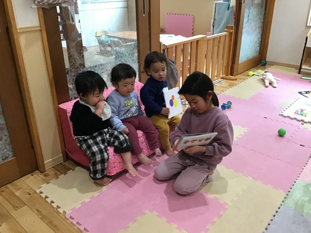 以上児の兄さんお姉さんたちにお世話をしてもらったり一緒に遊んだりしながら関わりを深めています。異年齢児の優しさに触れながら一緒に過ごし心地よさや楽しさ、喜びといったことを味わうことで、さらに人間関係を広げています。