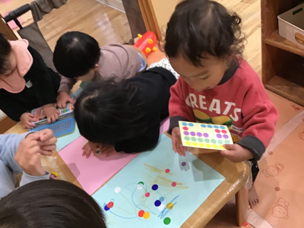 絵本や様々な教材に興味をもちながら、表現遊びを楽しみました。保育教諭等と一緒に歌を歌ったり絵本の世界をごっこ遊びに取り入れ楽しんだり、お絵描きやシール貼りに夢中になったりと、 遊びの中で表現することの楽しさや満足感を味わうことが、感性が豊かに育まれるきっかけとなっていきます。