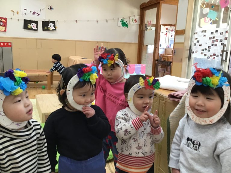 指先を使い花紙をちぎったり貼ったりしてお面が出来ると鬼になりきり歌ったりダンスを楽しむ姿が見られます […] -