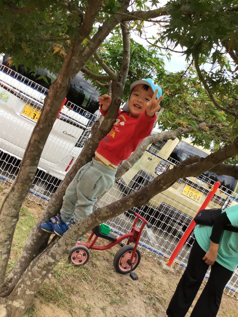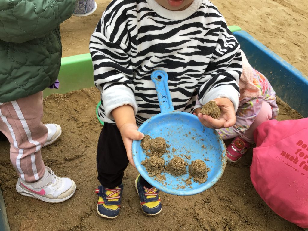 戸外で伸び伸びと身体を動かし遊ぶひよこチーム。木登りにチャレンジしたり園周辺に草花を探しに行ったり楽しんでいます。砂場では型抜きに夢中で「たこやき!」「アイス!」と様々なものを作って「食べて!」と届けてくれます。