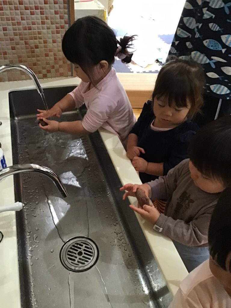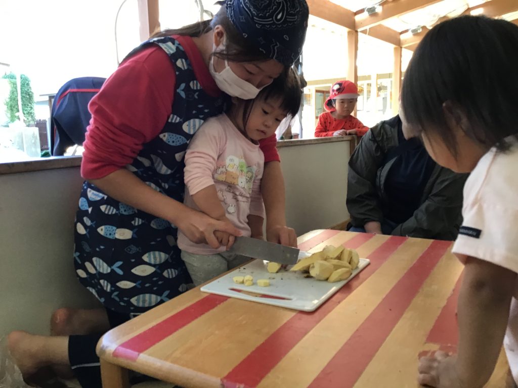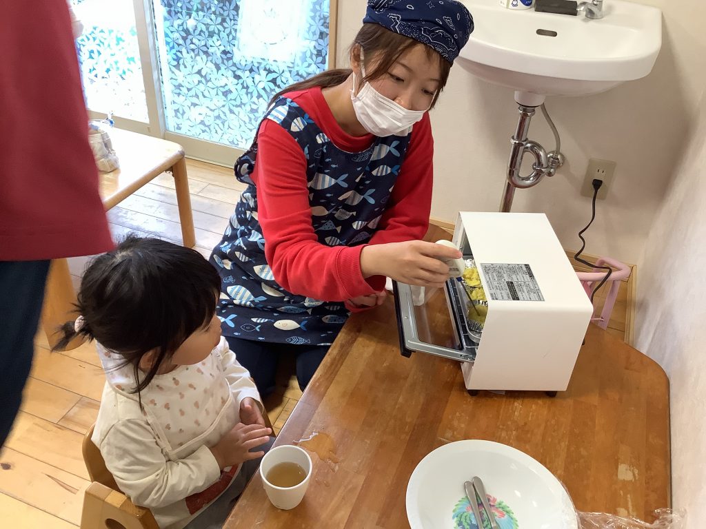 掘ったお芋でクッキングをしました。保育教諭等と一緒に洗って切ってつぶして、おやつの時間に焼いて食べました。焼ける様子をじっと見つめたり焼き上がると「ちょうだい!」「おいしいね!」と嬉しそうな声がたくさん聞こえてきました。