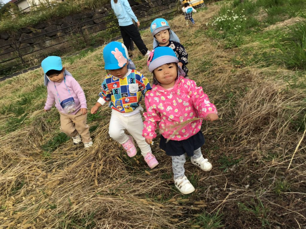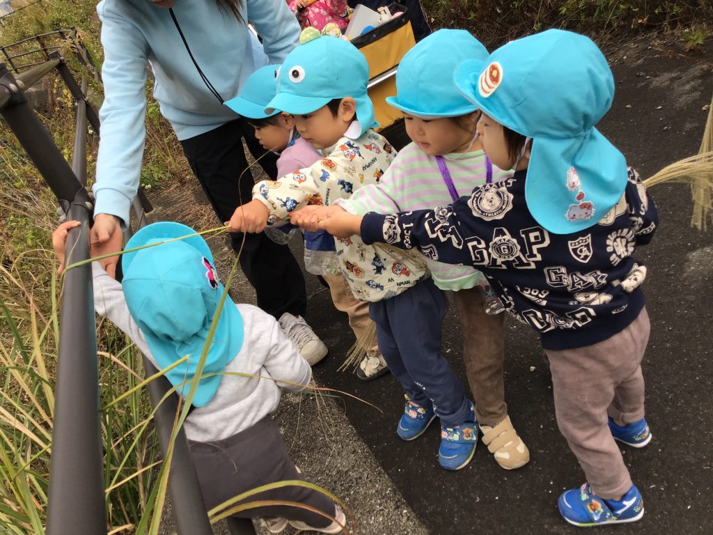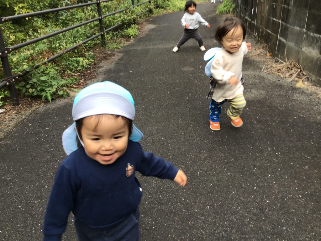 園の近くの川沿いに探索へ。車通りの多い所では、「赤は止まれだね」など交通ルールを確認しながら歩きました。川沿いでは「何かある!」と自分たちで発見した自然物を採りながらじっくり観察したり、広場で走ったりと楽しんでいました。