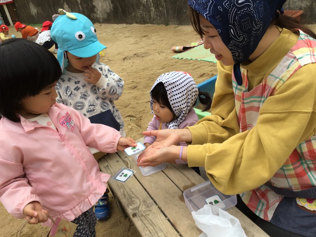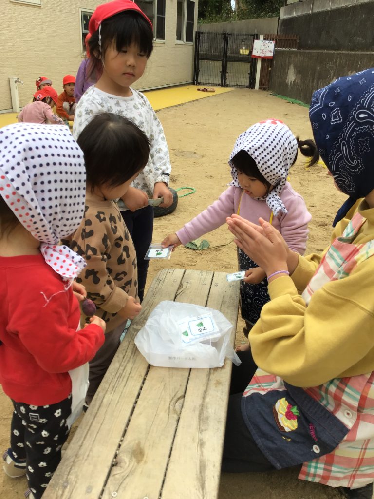 種屋さんごっこをしました。お店屋さんとお客さんに分かれ「種ください!」とチケット出すと「はいどうぞ」とお店屋さんが種を渡してくれ、そのやり取りが楽しく、役割を交代しながら繰り返し遊ぶ様子が見られました。