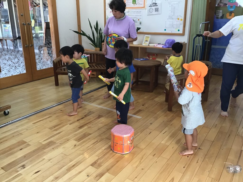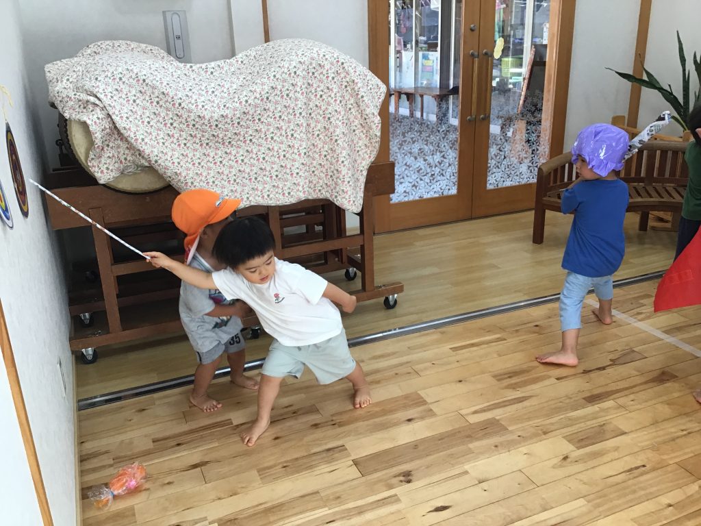 広告紙や廃材を使って、バットやボールを作って【野球ごっこ】が始まり、そこへ太鼓を持った応援団もやってきます。一人一人なりきり遊びを楽しむ姿が活き活きと見えます。イメージを膨らませ、作った物で遊ぶ楽しさを味わっているすずめさんです!!