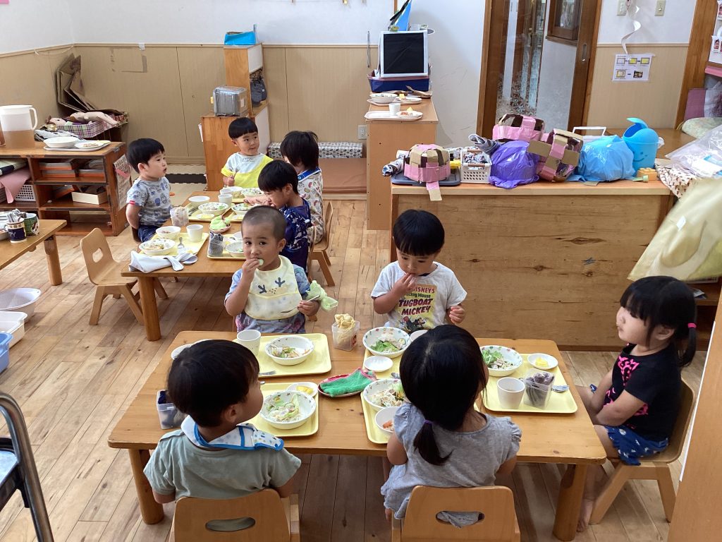 紅葉を消毒してもらい袋に入れて氷を作りました。翌日素麺を茹で、自分たちで作った氷の上に盛り付けをして食べました。「冷たくておいしいね!」「そうめんをポキポキしたね」など話しながら楽しく食事をし、自分たちで準備をしたランチは格別のようでした!!