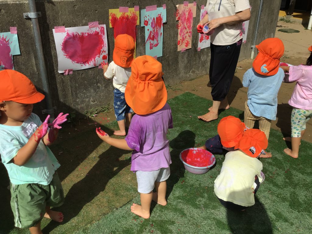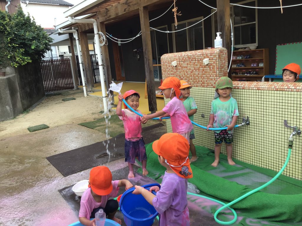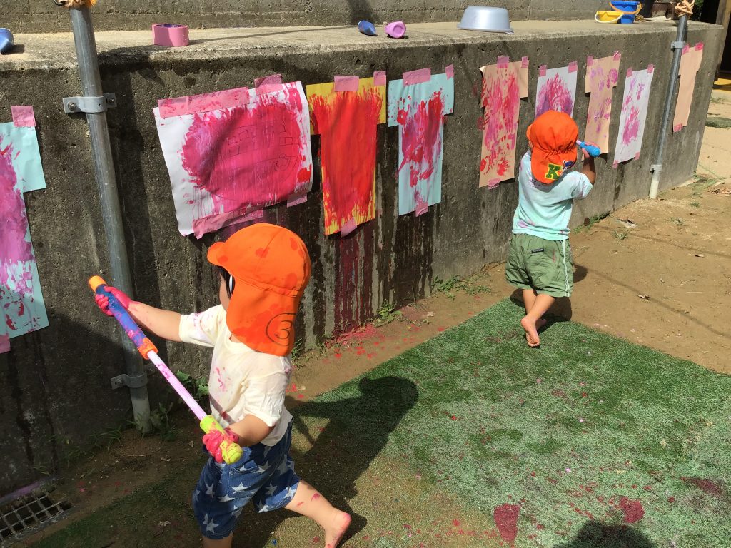 絵の具を混ぜて両手につけると、壁の画用紙や保育教諭等の洋服にペタペタとペインティング。絵の具の感触が苦手だった園児も、楽しさが分かると夢中になっていました。手を洗った後の色水を水鉄砲で飛ばしたり、ホースを持ち勢いよく水を飛ばし消防士になりきって遊ぶなど、夏ならではの遊びを楽しんでいます。