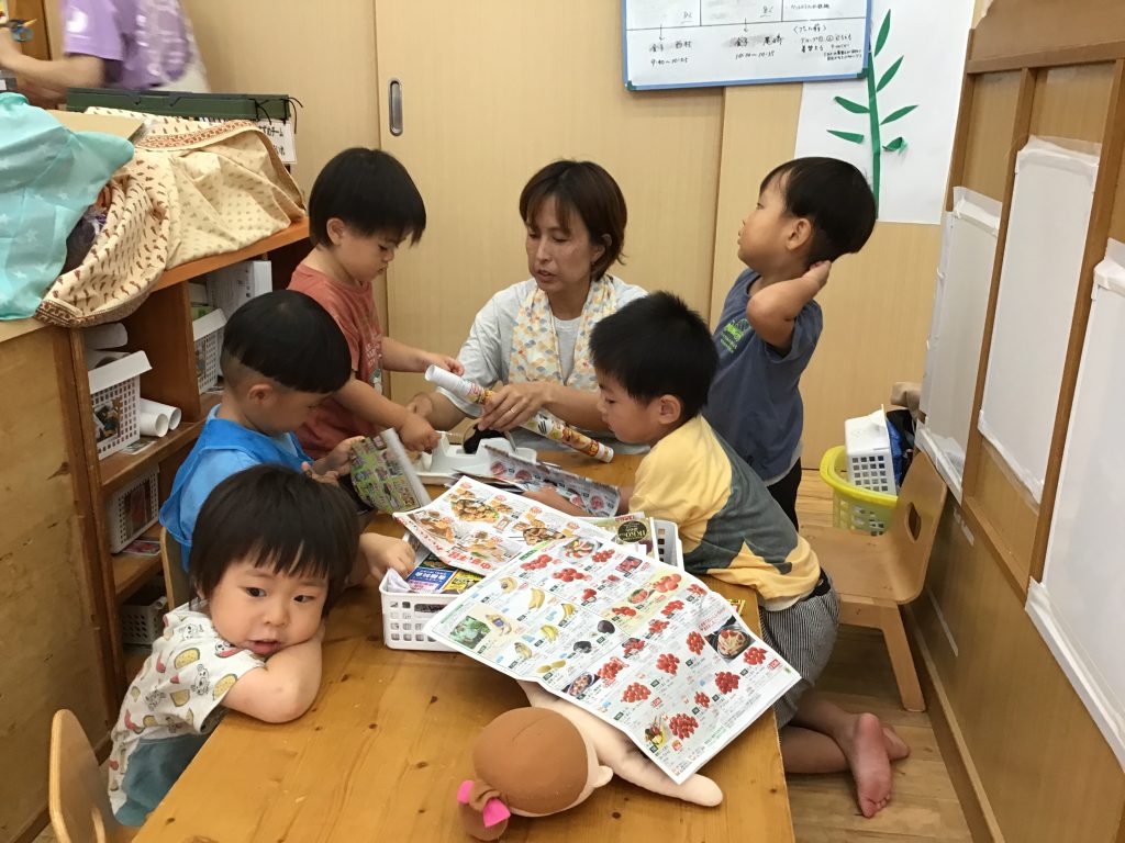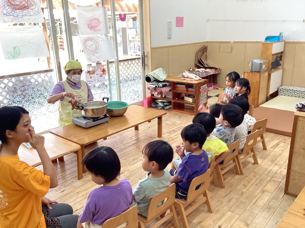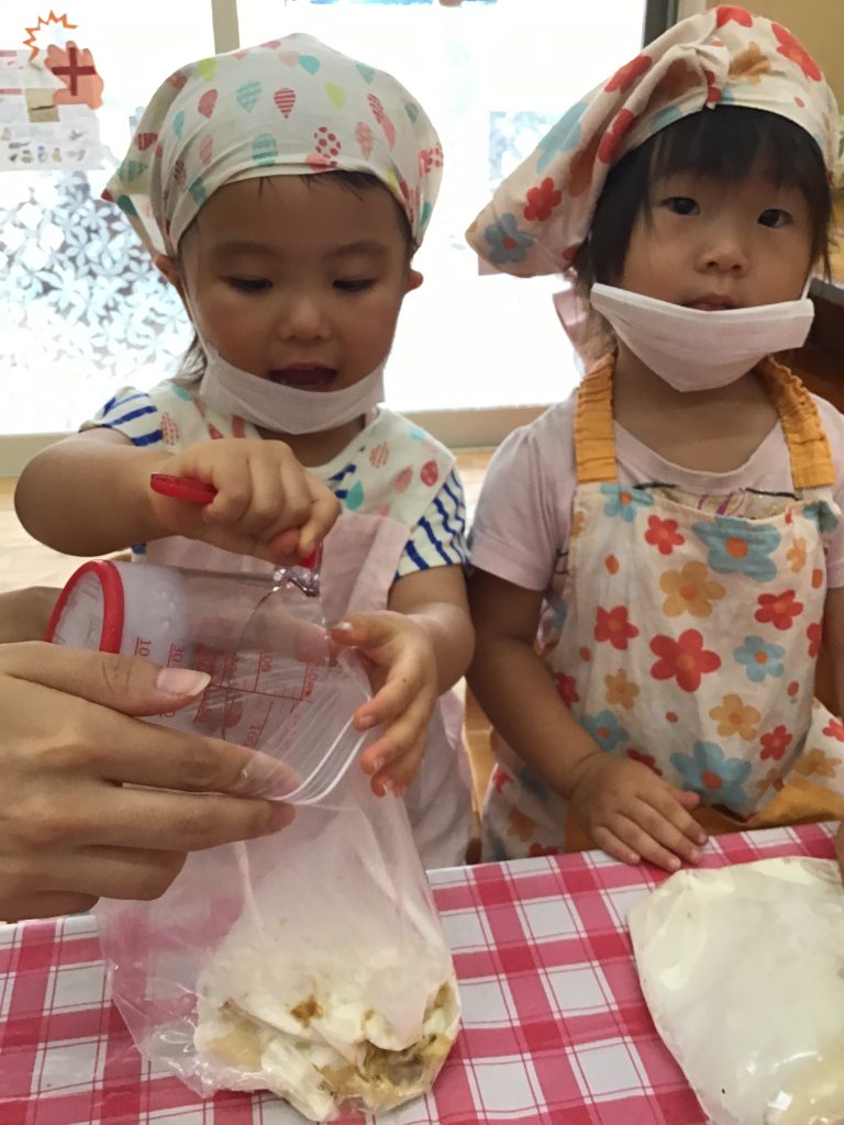 午前中のうちにバナナや牛乳など混ぜたアイスを作り、午後からのおやつタイムを楽しみにしていました。混ぜるとトロトロ状態に変わっていく様子に興味をもち、「おいしくな~れ!」と願いを込めながら冷凍室へ!!作る経験を通して「食」への興味関心が高まっていきます。