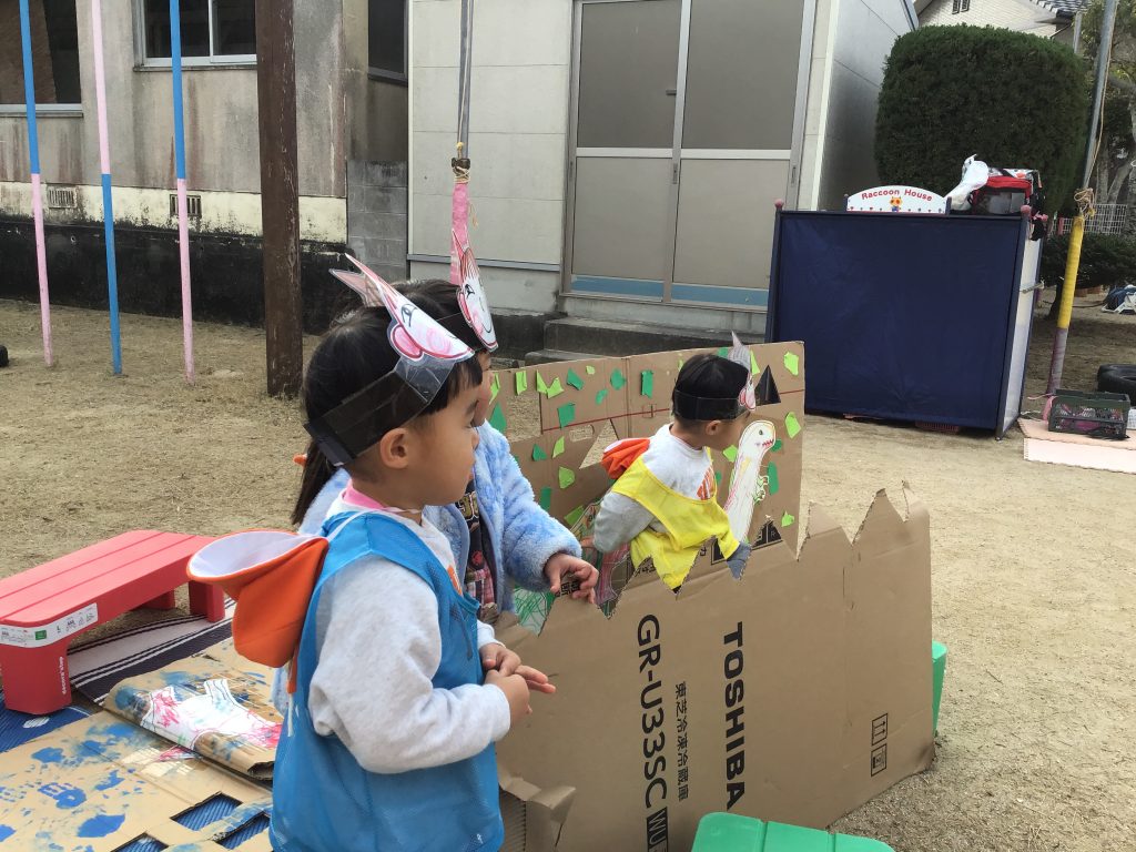 劇遊びやなりきり遊びを思いきり楽しむ姿が見られます。身振りや言葉にして表現することで絵本の中の世界が繰り広げられています。