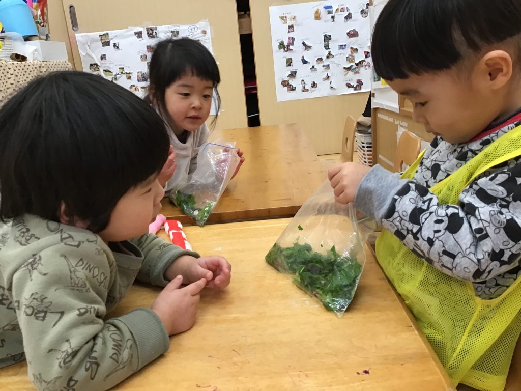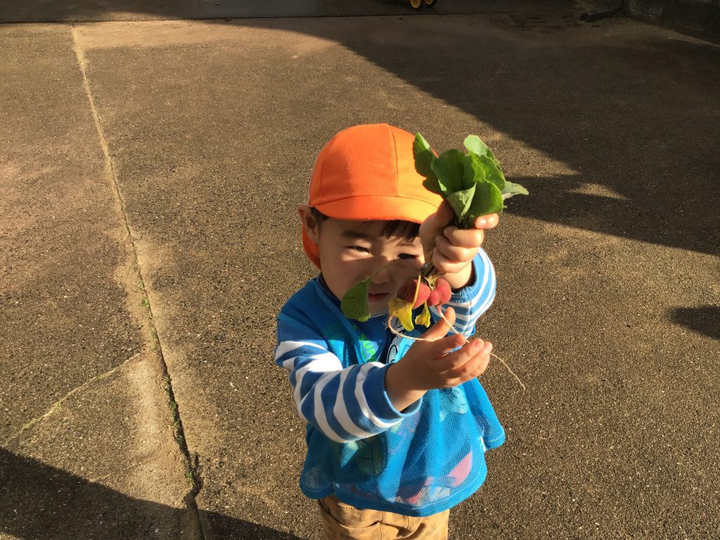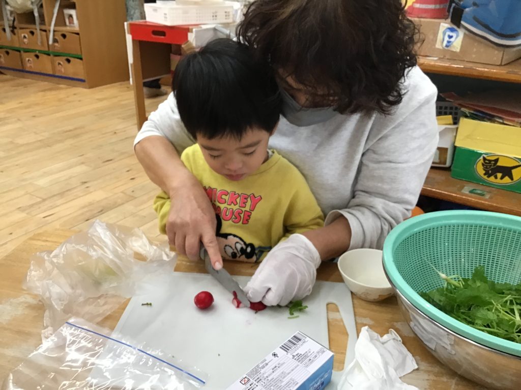 育てていたラディッシュを収穫し漬物作りをしました。匂いや色を感じ取りながら食への興味関心を広げています。