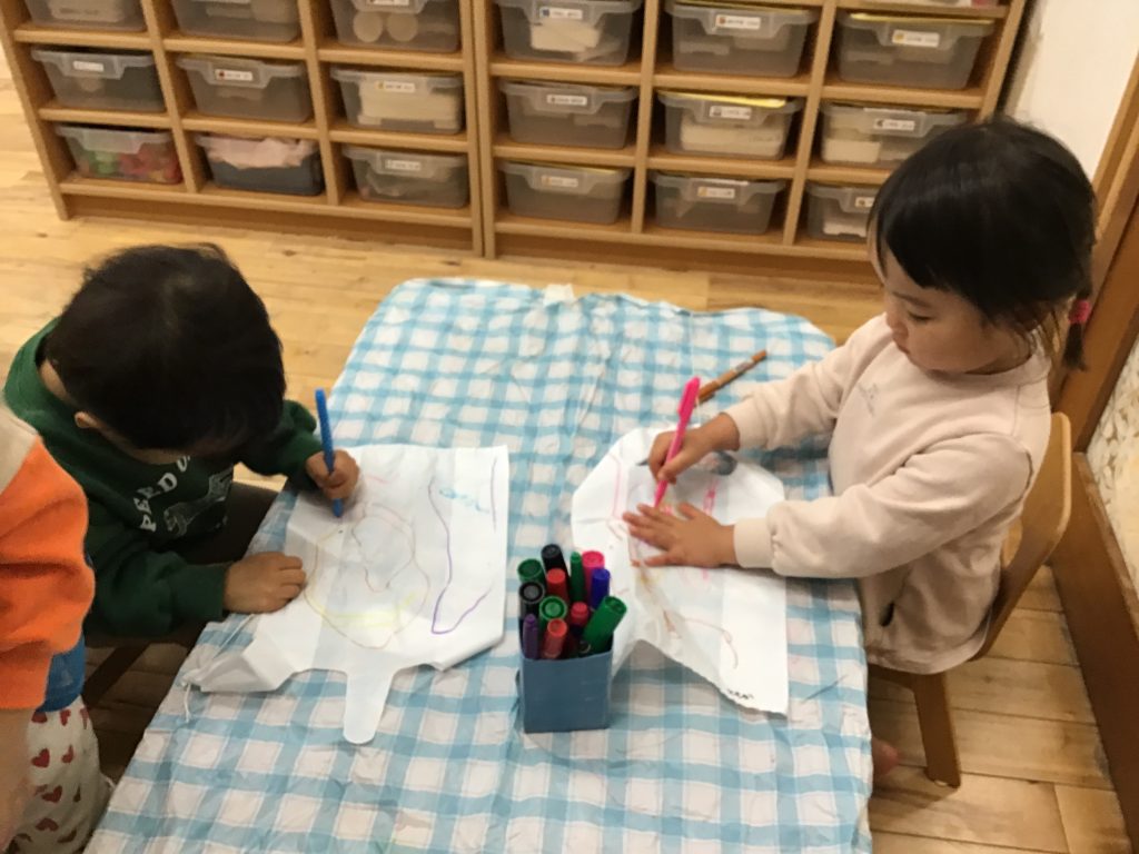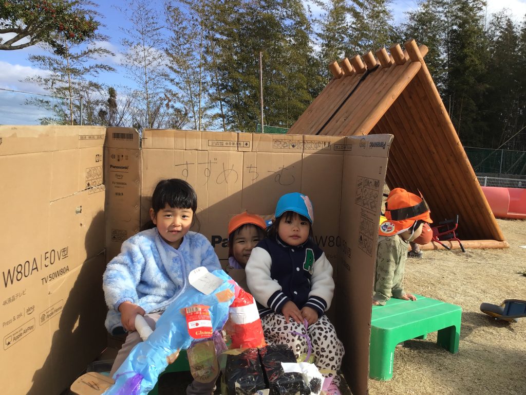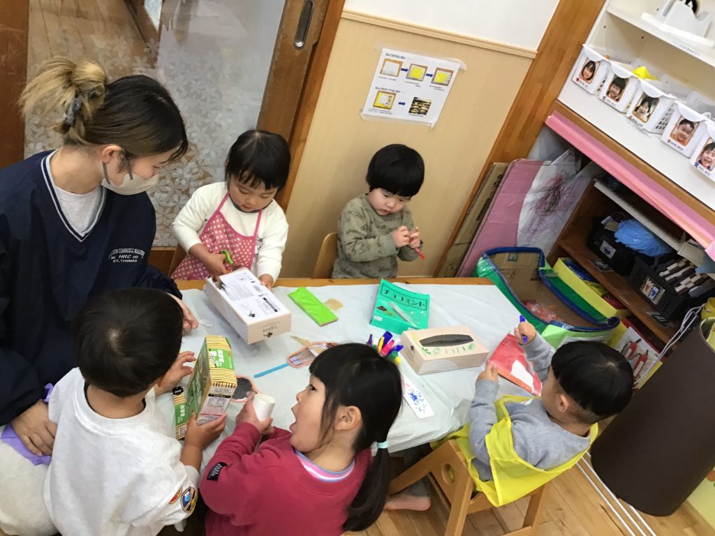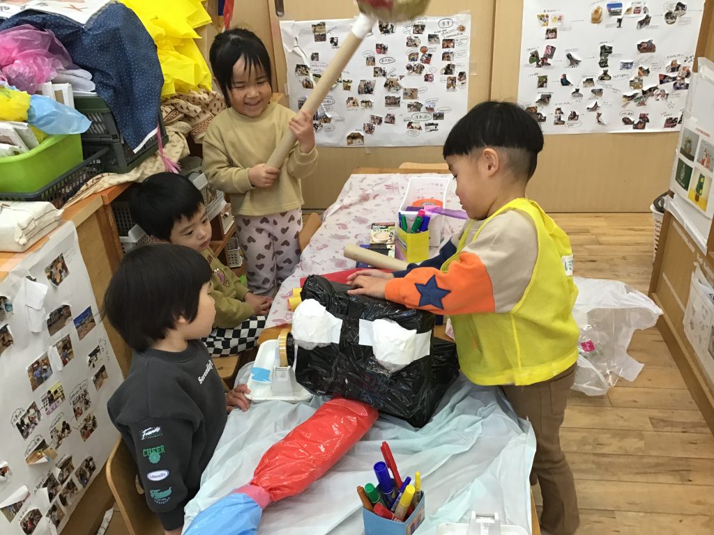 廃材遊びが盛り上がっています。どの材料が必要なのかを一緒に考えています。「作りたい」を実現させ思い思いの作品に嬉しそうにする姿が見られます。