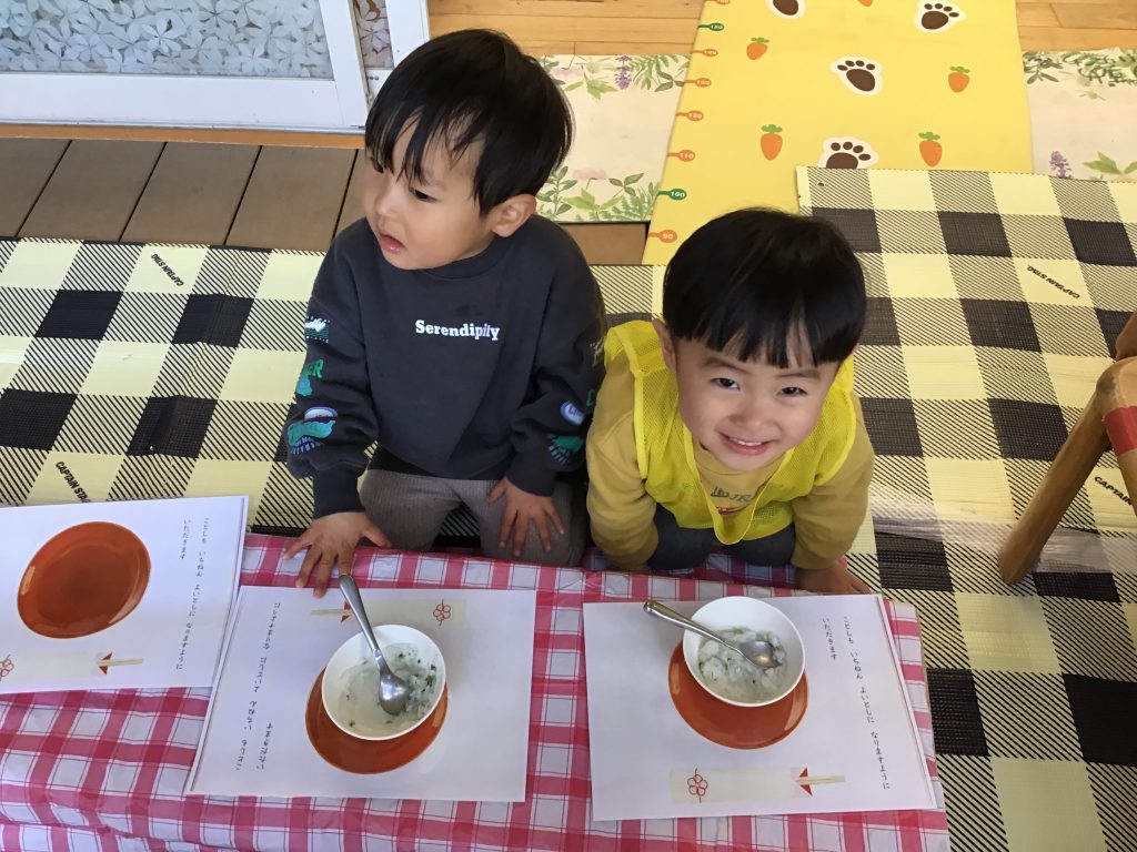 凧揚げやこままわしなどの伝統的な遊びや七草粥の炊き出しなど友達と一緒に楽しく経験することで、季節行事や文化に親しみ、新年を祝う雰囲気を味わっています。