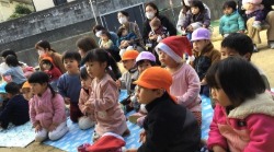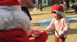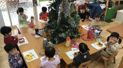 クリスマス会に参加しました。ペープサートやキーボード演奏に合わせて歌ったり、製作したツリーにオーナメントを貼ったりして行事を楽しんでいました。サンタさんから一人ずつプレゼントももらい少しドキドキしていたようですが「絵本もらった!」と嬉しそうに報告してくれました。