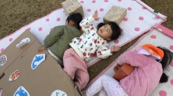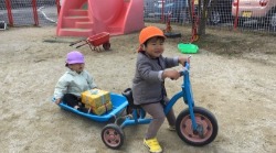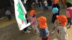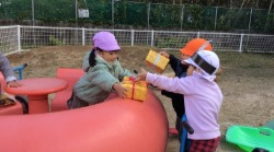 クリスマスまでの間に、サンタさんになりきって遊びました。最初はプレゼントを運ぶだけだったのが、お面や帽子を準備したりお家に見立てた段ボールにイラストを貼ったりするうちにイメージが湧いてきたようで、「お家で寝よう!」と言ったりサンタさんがこっそりお家に入りプレゼントを置いて行ったりと、それぞれが役割を決めてやり取りをしながら遊び、友達との関わりが広がってきています。