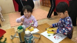 お弁当日はドームからツリーを借りて来て、クリスマスの雰囲気を味わいながらランチタイムを楽しみました。おやつのプチクッキングも少しずつ慣れてきたようで自分でパンに塗ることを喜び嬉しそうなすずめさんです。