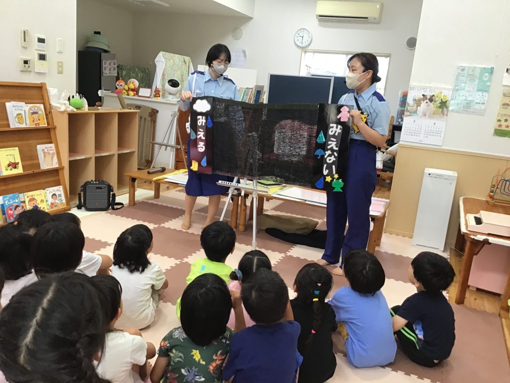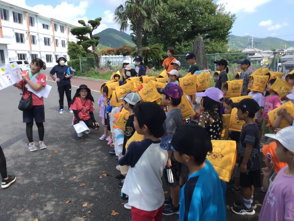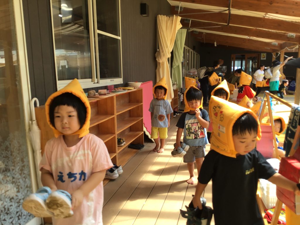 フレンズさんと合同の地震の避難訓練に参加しました。「地震です」の放送が聞こえると、慌てながらも机の下にダンゴムシのポーズで避難する姿が見られました。実際の避難場所である緑小まで、防災頭巾を被って歩き訓練しました。