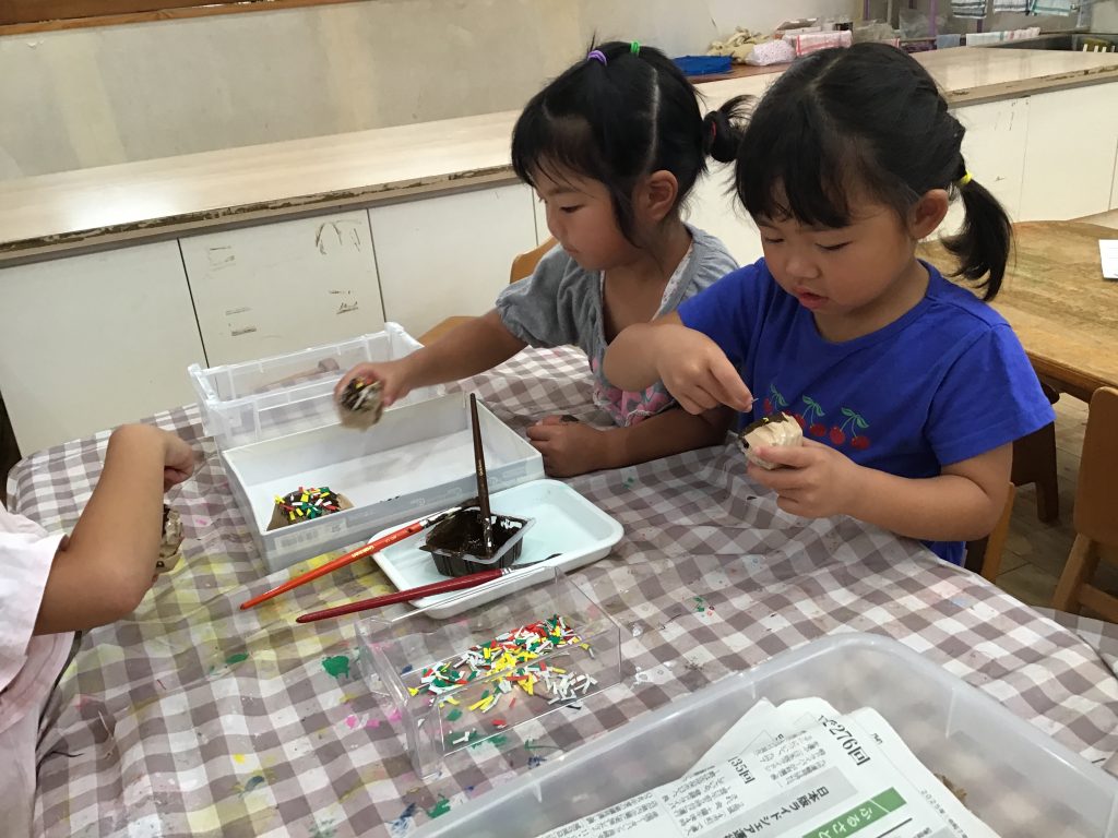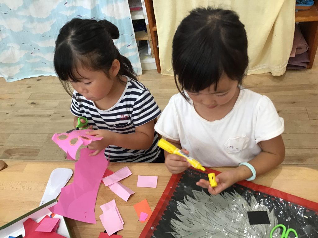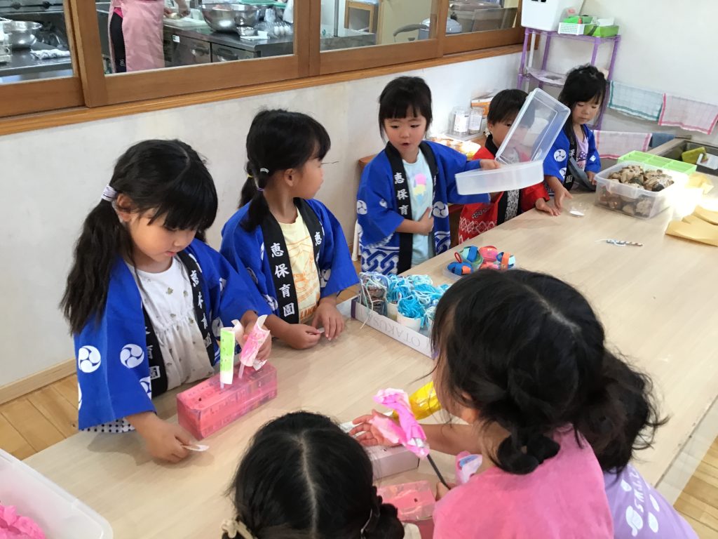 商店街の夜市の後、どんなお店があったか、何を作ってみたいのかの作戦会議をし、製作やごっこ遊びを楽しみました。遊びの中で足りない物に気付き、いろんな物を作り足してはどんどん盛り上がっているところです!