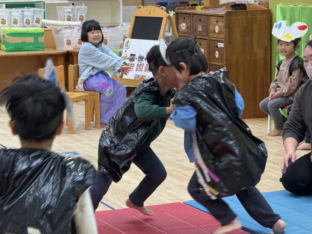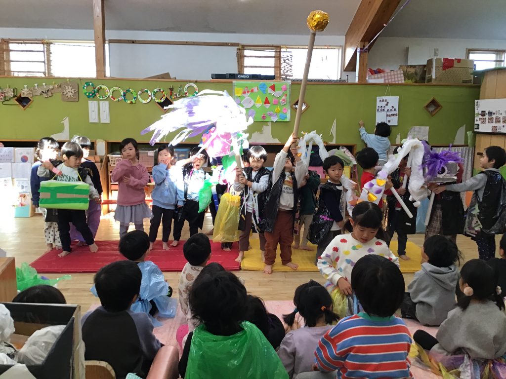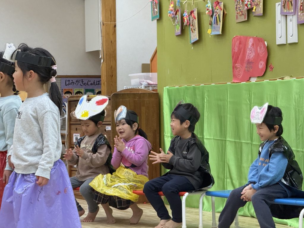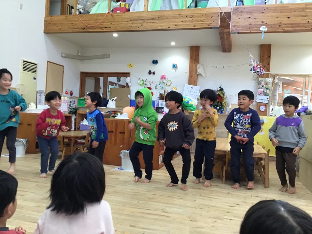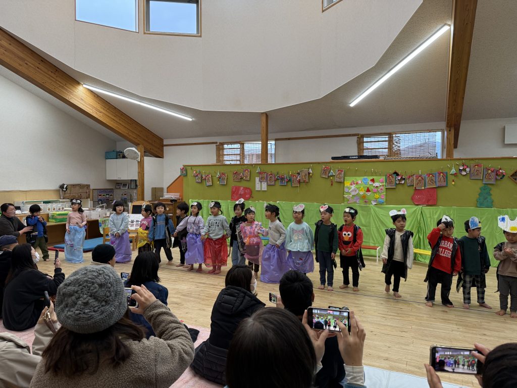 おたのしみ会では沢山の保護者の方々に見守られながら自分たちのやりたいを詰め込みました。前に出て演じている園児もですが、その後ろに待機している友達がその様子を手拍子で盛り上げたり笑顔で嬉しそうに見守ったり、さりげなく次の準備をするなどの姿に感動させられました。その姿を見守る保護者の方々の表情もとても温かく笑顔の花がたくさん咲いたおたのしみ会でした。