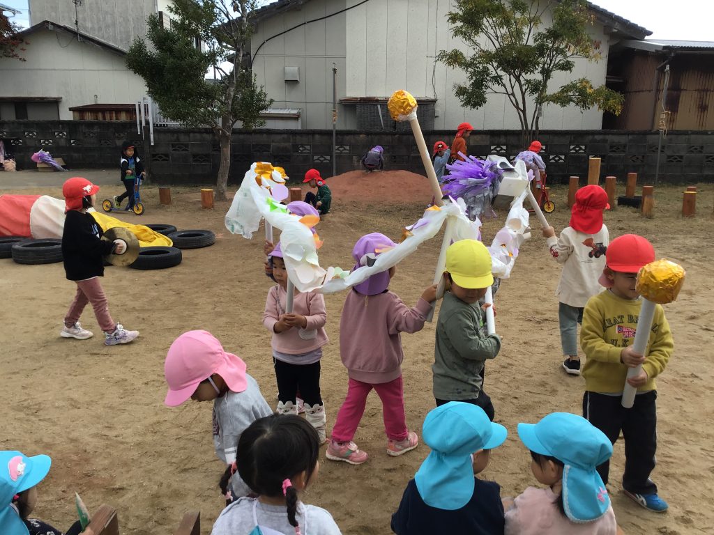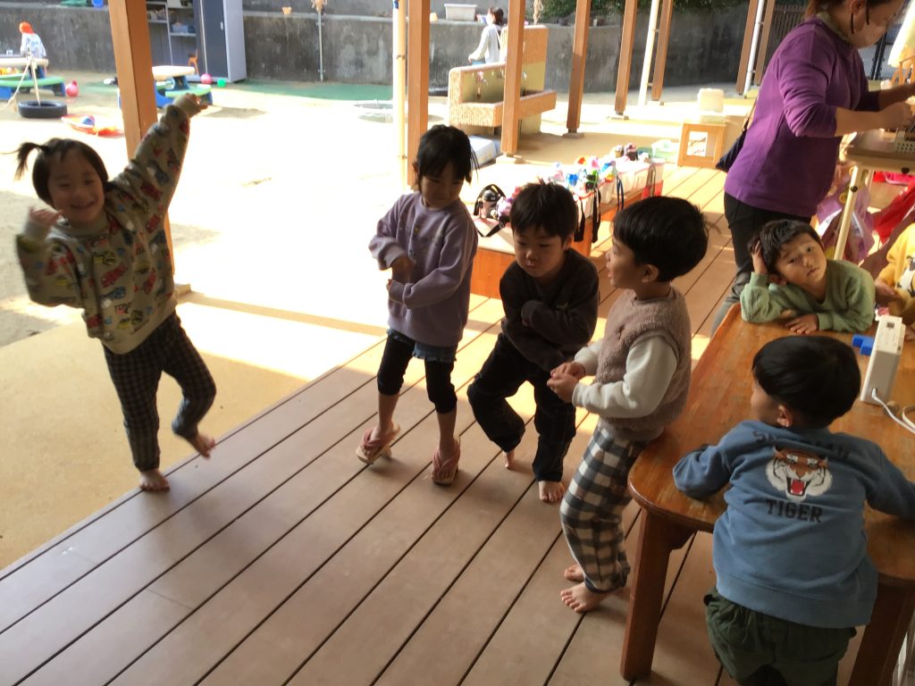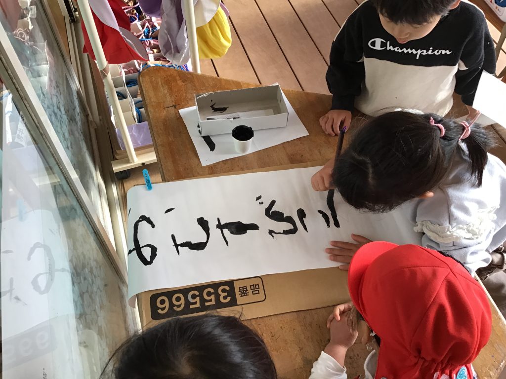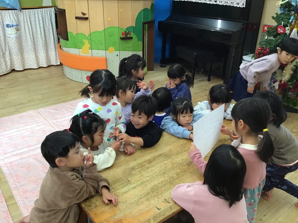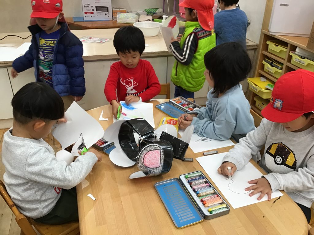 表現遊びを楽しむために必要な物は何だろうと話し合い、様々な物を作ったり書いたりという経験をした12月。友達が取り組んでいる姿に興味を示しそれぞれのタイミングで準備し挑戦!難しい部分や分からないところは近くで見守ってくれている友達が優しく教えてくれていました。安心できる環境の中で失敗してもいいからやってみたいの気持ちをどんどん育んでいきたいです。