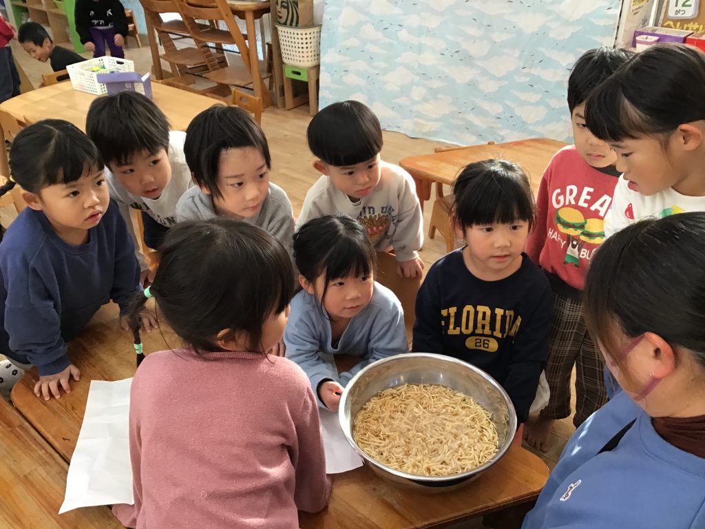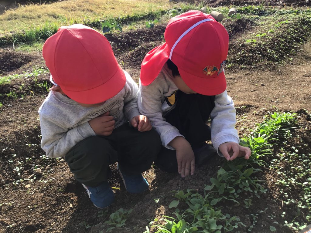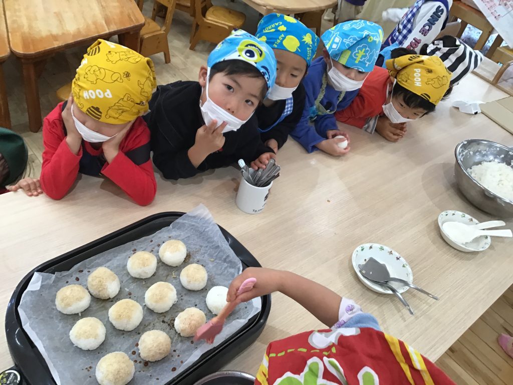 「にんじんさん大きくなぁ~れ!」と人参の芽の隙間からでてくる雑草を抜きながら野菜の生長を楽しみにしています。毎朝の野菜の皮むき・野菜切りも上達し12月は色々なクッキングにも挑戦しました。定番のカレー作り・焼き芋・焼きおにぎり・ケーキのデコレーション・大根かんころを戻して食べてみようなど食への興味が広がるような活動を大切にしながら、食べる楽しさやマナーにもつなげていけるよう取り組んでいます。