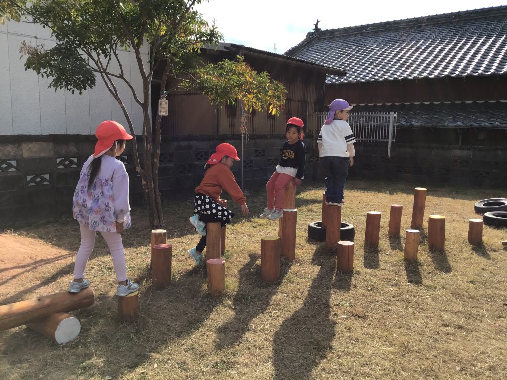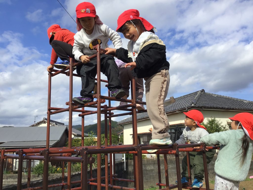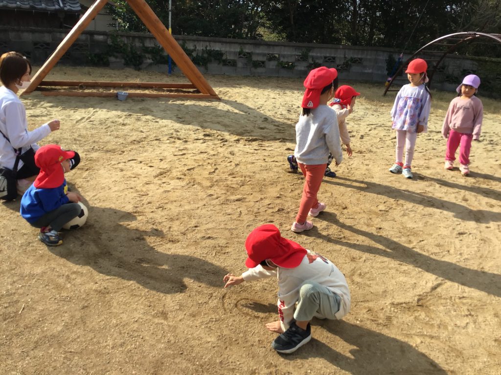 元気に園外に飛び出し心も体も解放し伸び伸びと遊んでいます。ここでも友達と互いに刺激を受け合いながら怖いけどやってみたらできたなどの経験を積んでいる園児たちです。友達はどうやってるんだろう?と見つめる眼差しは真剣です。遊具も譲ったり順番を自分たちで決めながら楽しむ姿に心の成長を感じます。近頃のブームは転がしドッヂです。