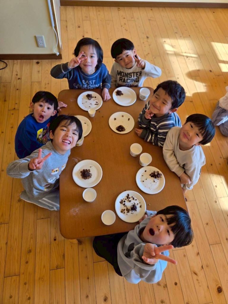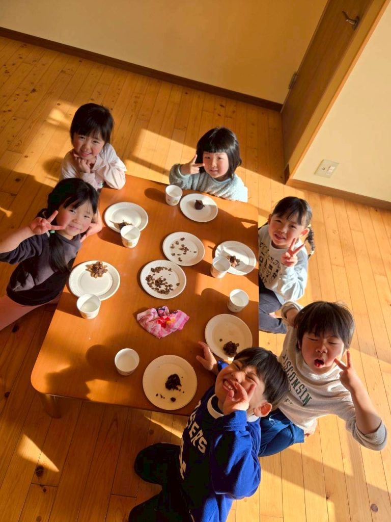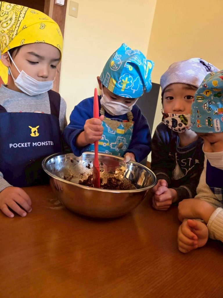 クッキング大好きつばめさん。家やテレビから情報をキャッチし「チョコパイでまつぼっくりケーキが作れるらしい!作りたい!」と提案。自分たちで材料を買いに行きクッキングを楽しみました。チョコパイをつぶし混ぜる工程では友達が混ぜやすいように押さえてくれたり、自分ばかりが混ぜるのではなくしていない友達のことを意識しながら次の人に渡したり。優しさがいっぱい詰まったまつぼっくりケーキの味は最高だったようで大人には当たりませんでした。