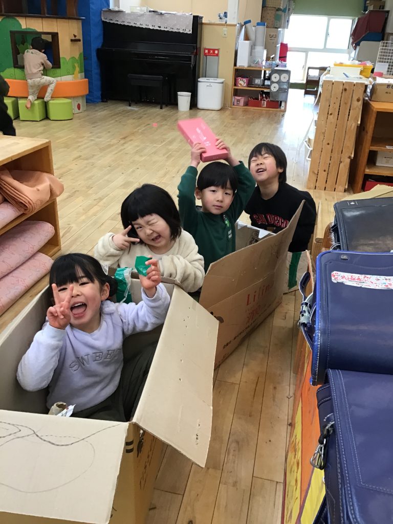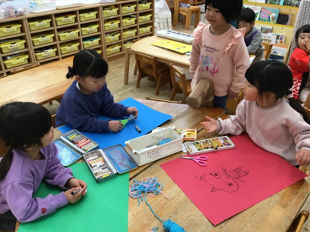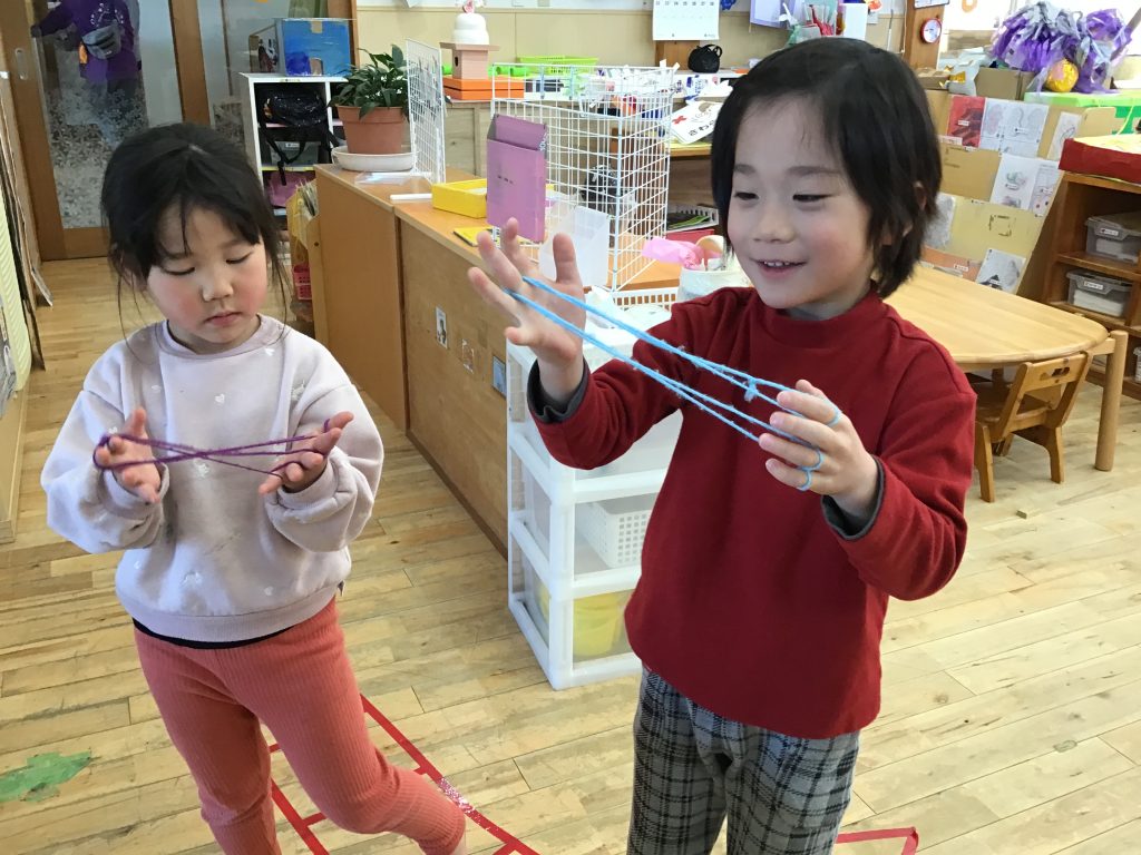 寒い2月でしたが、室内でも園児たちはイメージを膨らませながら色んなことに挑戦したり、友達と取り組む姿が見られました。節分では、鬼に来てほしくない!お祭りみたいに楽しい節分にしたい!という願いから自分たちでイラストを描き小さい友達も楽しめるゲームを作ったり、節分の由来などを知るよい機会となりました。毛糸で編み物をしたり、製作に取り入れたり、あやとりに夢中になる園児もぞくぞくと増えています。お家での家族時間にあやとりいかがでしょうか?
