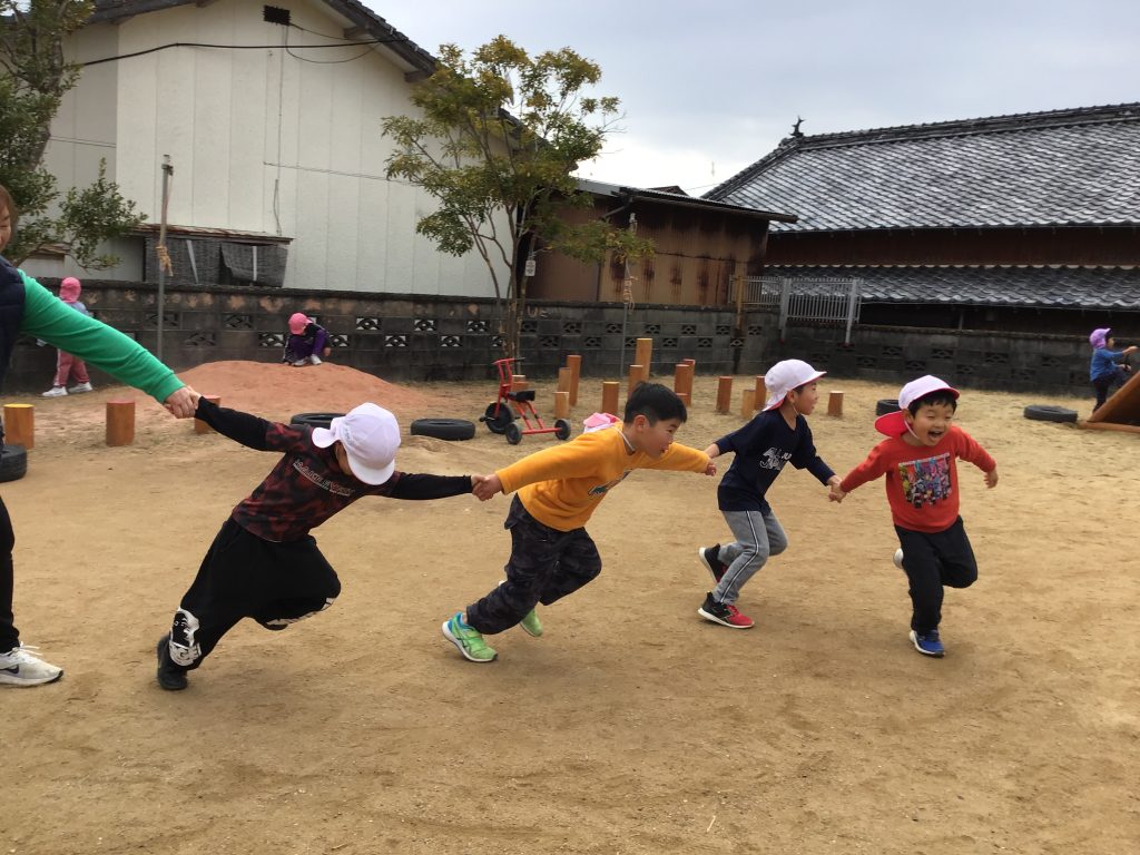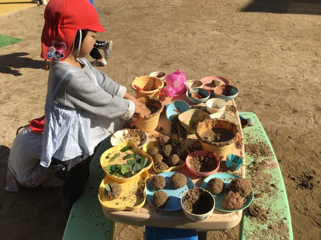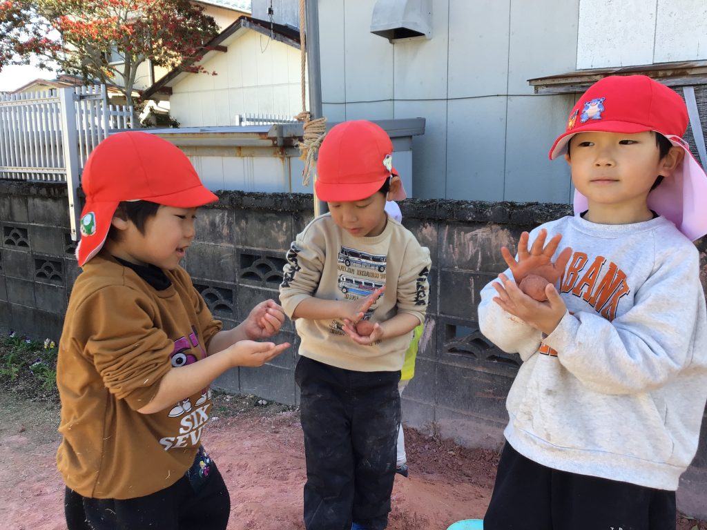 初めうまくまとめられなかった泥団子作り。続けるうちに水分量・土の質・力加減など様々な違いに気付き、それを互いに教え合ったり、人の作る様子をよく観察しながら作る姿が見られるようになりました。この泥団子づくりが今後もっと広がっていけるよう園児と一緒に作戦をたてながら環境を準備していきたいと思います。また、大好きなはとさんとの集団遊びもルールが少し難しいものに挑戦中!!寒くても戸外で元気に楽しみながら体を動かしています